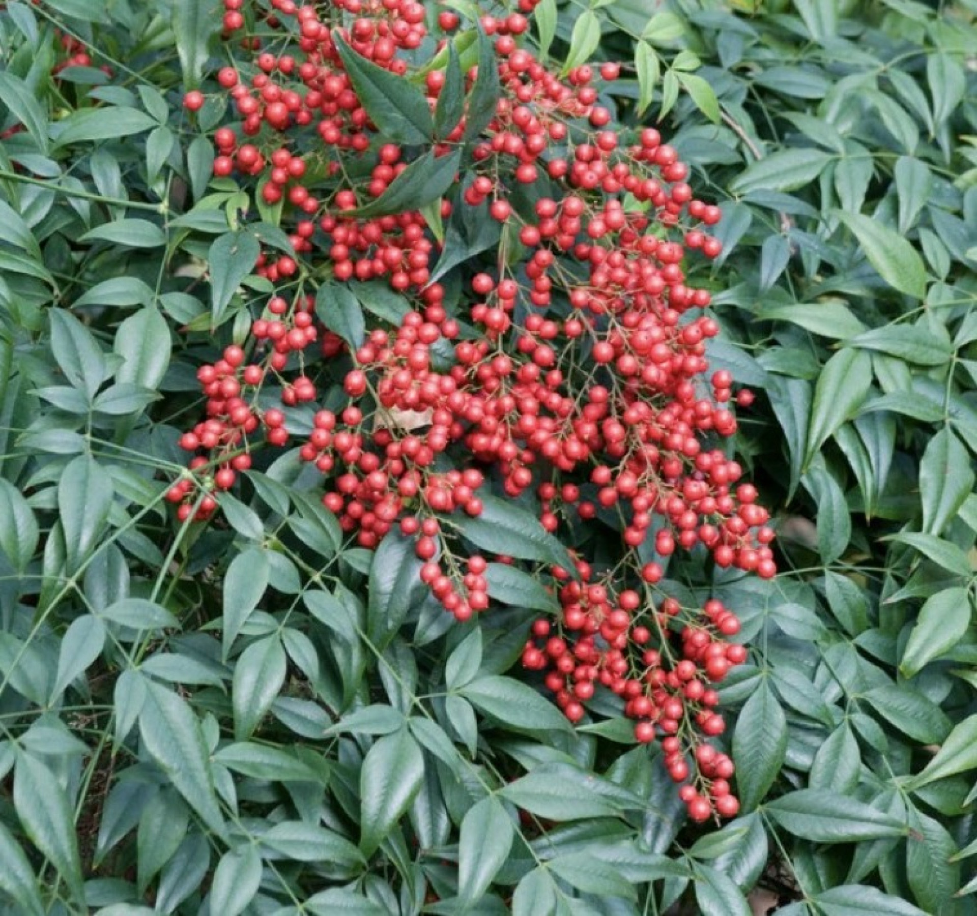 1,5 méter magasra és kb 1 méter szélesre növő örökzöld díszcserje, melyet nyár közepén méretes fehér virágfürtök, ősszel pedig nagy tömegben fejlődő piros bogyók díszítenek. Lombozata télire bíborvörösre színeződik. Az egyik legszínpompásabb kerti örökzöld!