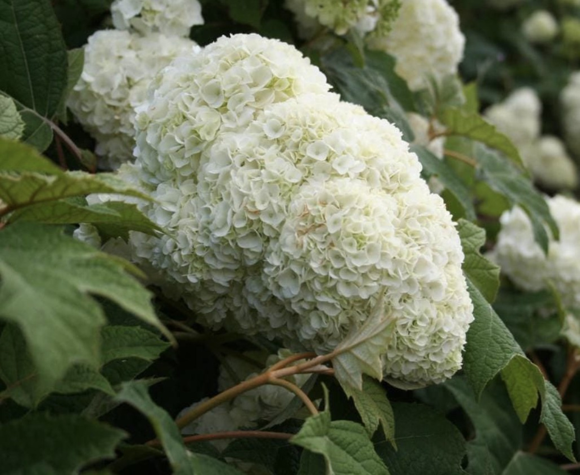 A tölgylevelű hortenzia újabb nemesítésű fajtája, melynek zöldesből krémfehér, majd rózsaszínes árnyalatúra változó hatalmas virágbugái a legnagyobbak a hasonló fajták között! A nyáron nyíló, tömvetelt virágzatok a 30-35 cm-es méretet is elérik, oldalra hajlanak a nagy súlyuk miatt. Ez különösen a méretesebb, fejlettebb bokrokon nagyon látványos! Másfél méter körüli magasságot elérő, nagyon mutatós lombozatú cserje, melynek őszi levélszíne burgundivörös! A tölgylevelű hortenziák sokkal edzettebb növények, mint a hagyományosan ismert hortenziák: talajban nem válogatnak és a 2-3 évesnél idősebb példányok a szárazabb időszakokat is jobban átvészelik! Mindemellett nyilván sokkal szebben fognak teljesíteni, ha az aszályos időszakokban heti 1, vagy inkább 2 alkalommal egy-egy jó nagy vödör vízzel gondoskodunk róluk! A tölgylevelű hortenziák további érdekessége, hogy nagyon enyhe teleken lombozatukat megtartják, szinte örökzöldként viselkednek.