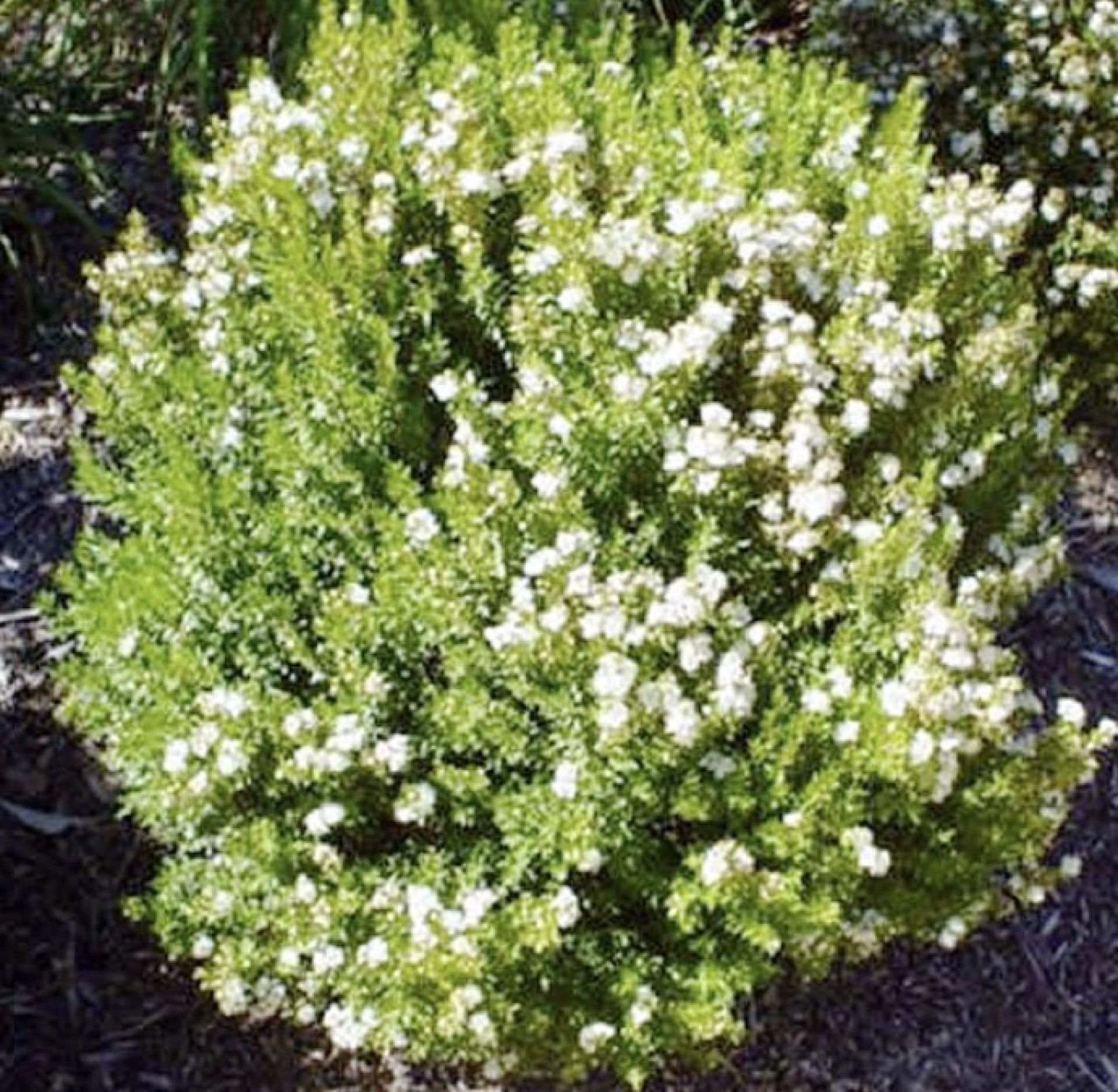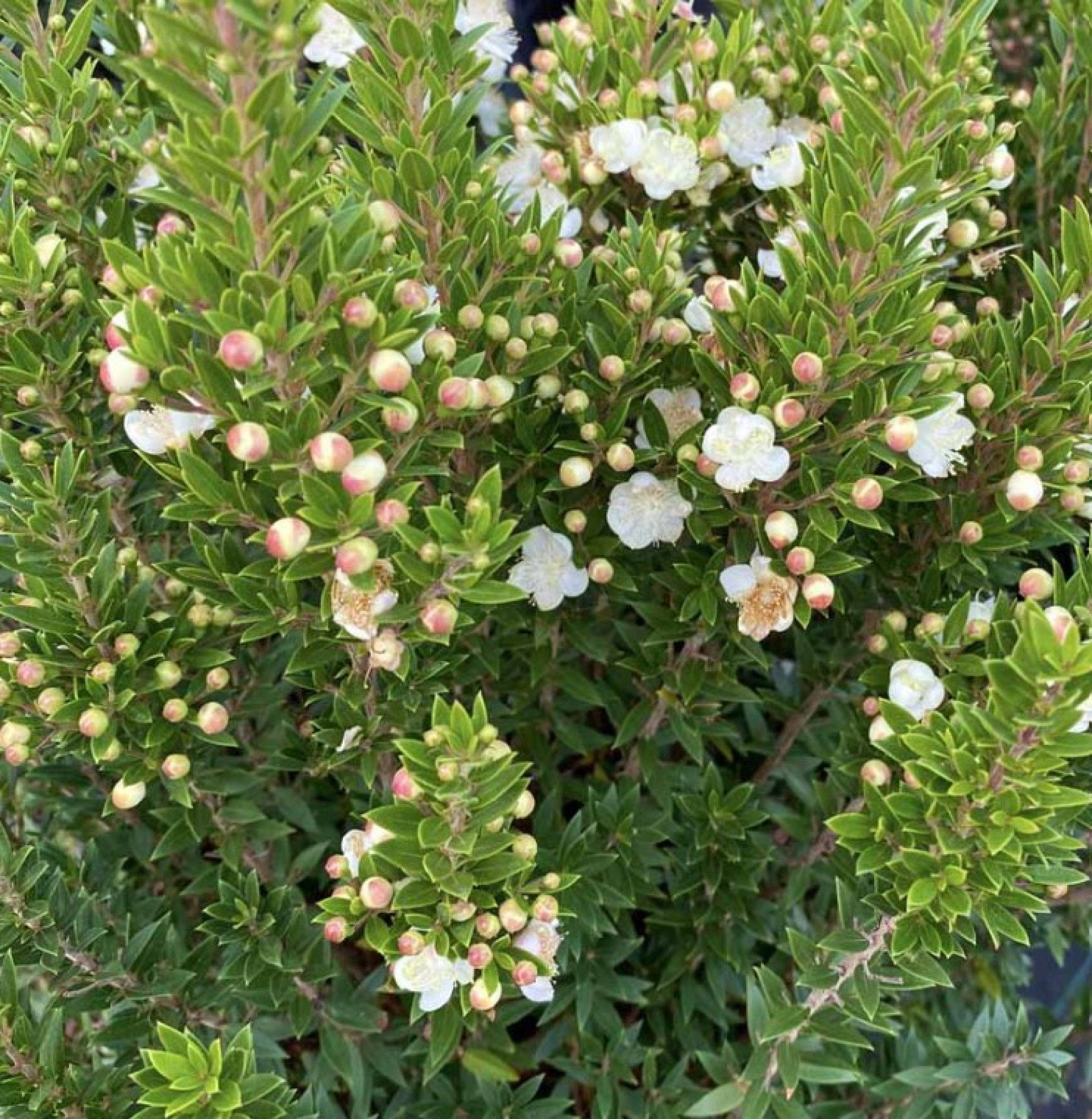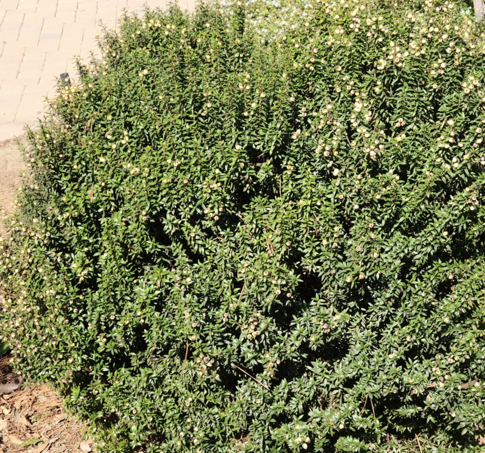 Mutatós lombozatú, örökzöld cserje, mely a mediterrán térség egyik leg-ikonikusabb eleme. Az alapfaj a természetes élőhelyein 3-4 méterre is nőhet, de ez a törpe változat legfeljebb 70-90 cm magasságot és hasonló szélességet tud elérni. Krémfehér, illatos virágait a hosszan kinyúló porzók teszik különlegessé. A virágbimbók gömbölyűek. A tömegesen termő kékeslila termése a növényt a virágzás után is igen látványossá teszi. Az egész növény (virág, termés és a levelei) sok illóolajat tartalmaz, amit az ókortól kozmetikai célokra használnak fel.