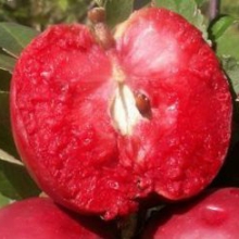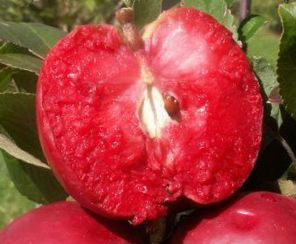 It is a sort dark red inside and outside, bred in the Research Institute of Weihenstephan, especially suitable for making wonderful unique red apple juice, but is also special and keeps good as apple puree, apple chips and apple jelly! It is worth mentioning the colour of the apple juice made of the variety Weirouge was still very nice red after more than two years of storage! Initially, the tree is of vigorous growth but later the large quantities of fruit slows it down. The fruit should be left on the tree until full maturity so that the beautiful red colour of the flesh can develop more forcefully.
