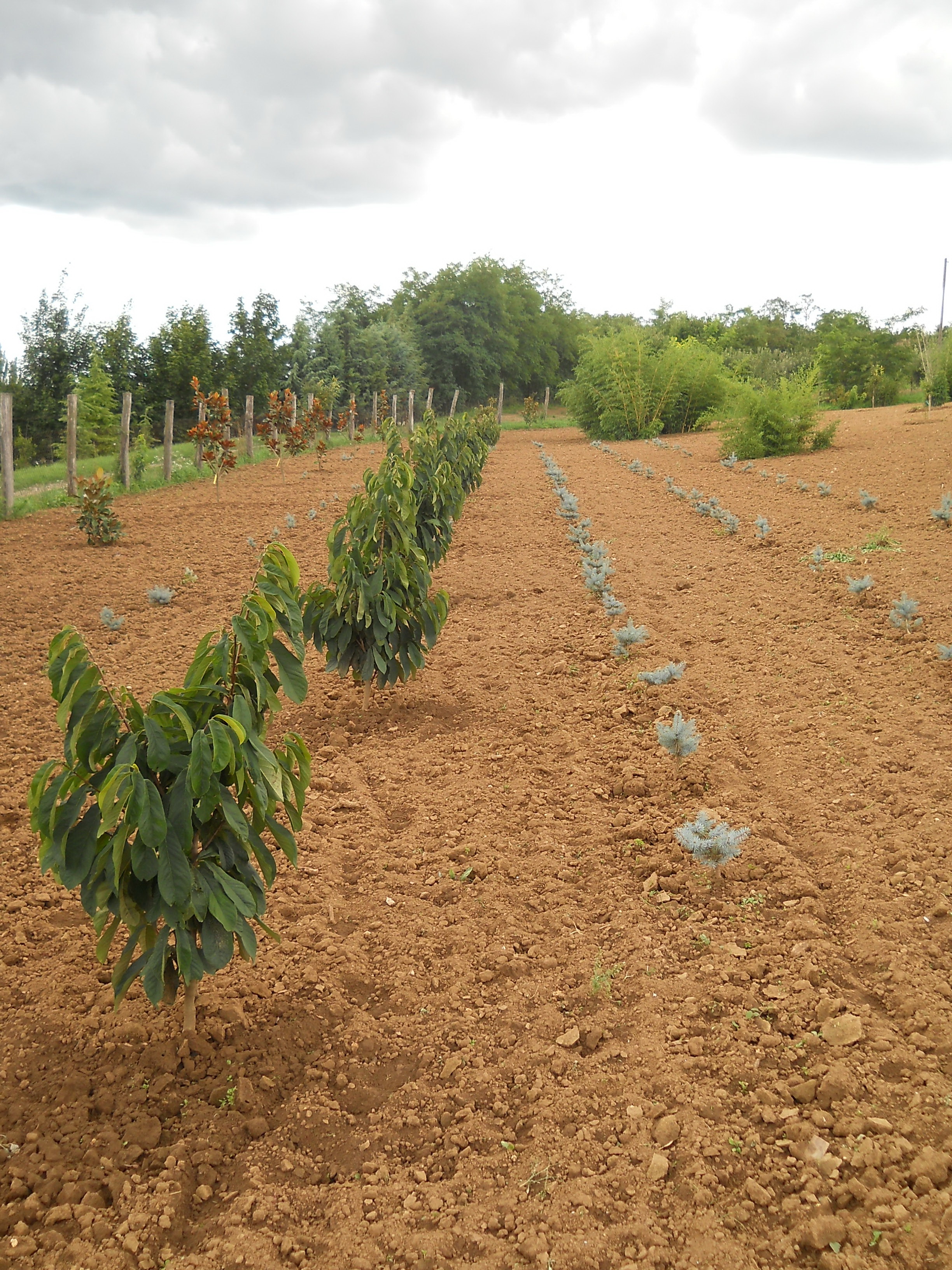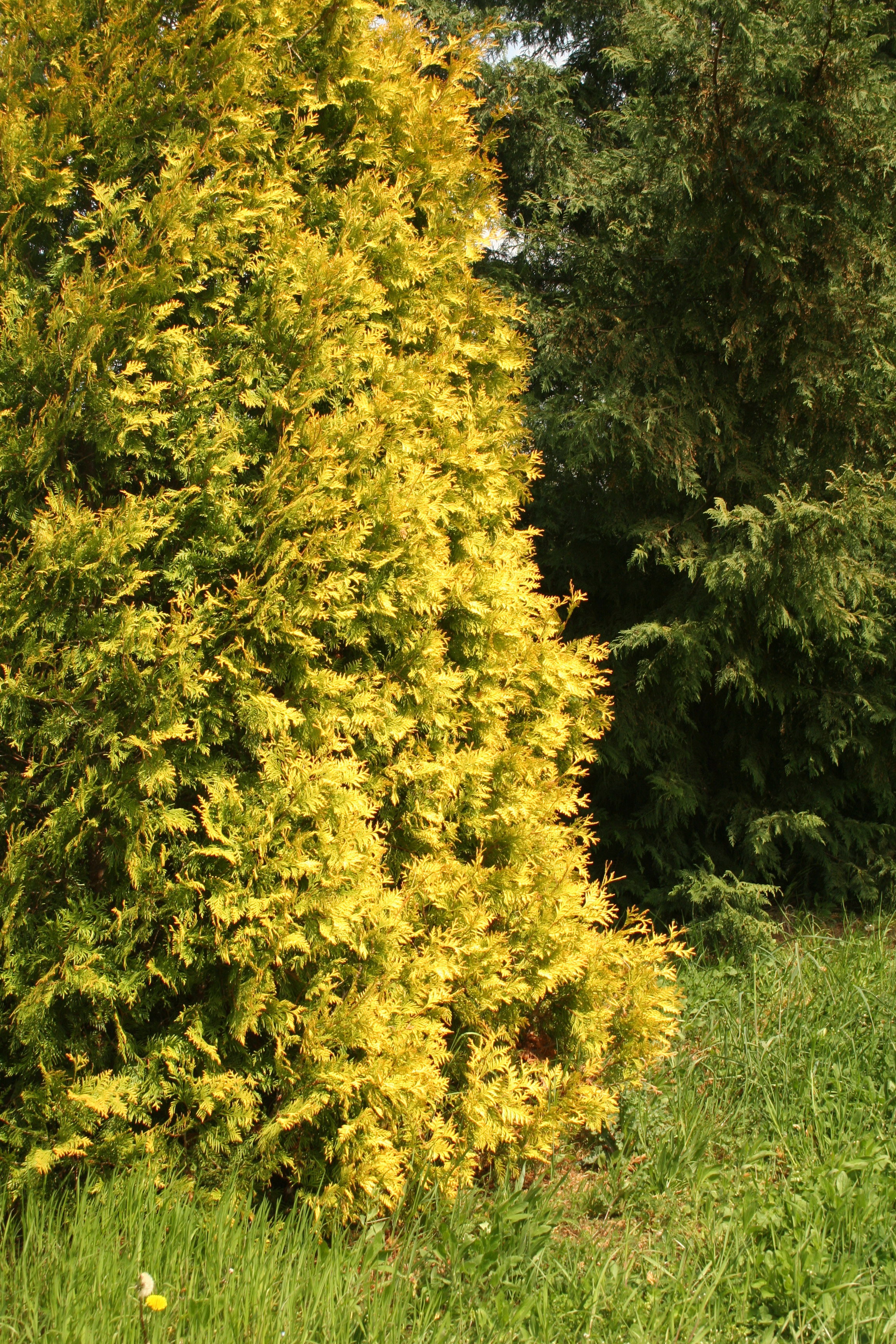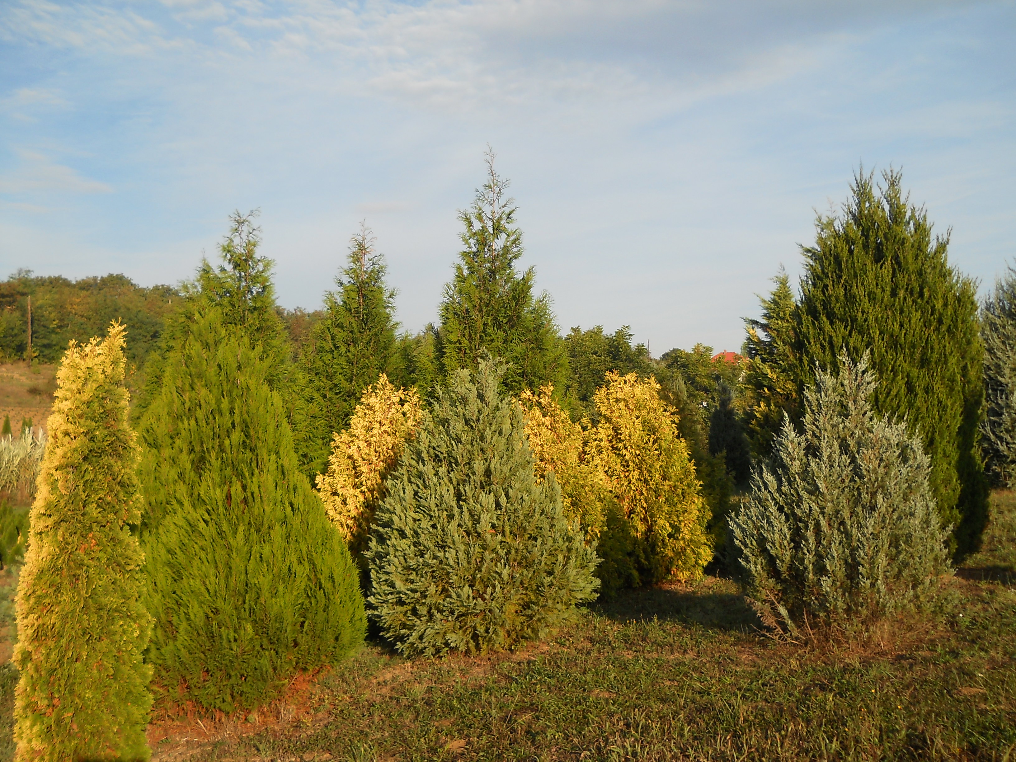A képen balról jobbra az alábbi növények láthatók: Thuja occidentalis 'Szőlősi', Chamaecyparis lawsoniana 'Pottenii', Chamaecyparis lawsoniana 'Pelt's Blue', emögött: Thuja occidentalis 'Europa Gold', ezek mögött: Thuja plicata 'Atrovirens' (3 db), a Thuja occidentalis 'Europa Gold'-októl jobbra elöl: Juniperus scopulorum 'Springbank', emögött: Juniperus virginiana 'Spartan'.