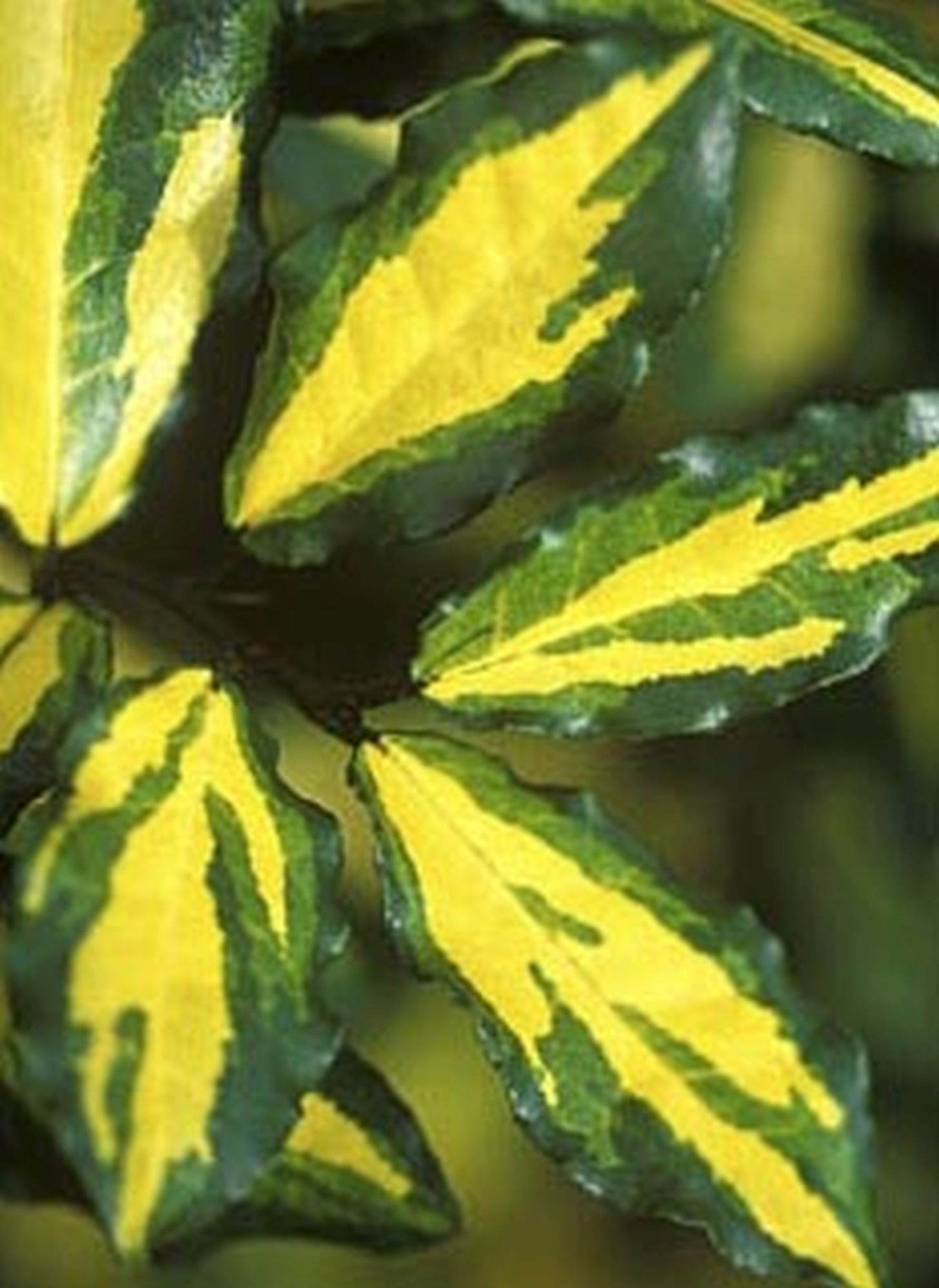 2-2,5 m-re növő örökzöld cserje. Hosszúkás tojásdad alakú leveleinek közepét nagy aranysárga folt díszíti, így az egész bokor vidám sárga tarkázottságú. Különösen jól mutat sötétzöld, vagy kék lombú örökzöldek előtt, de kiválóan alkalmas dézsás növénynek is.