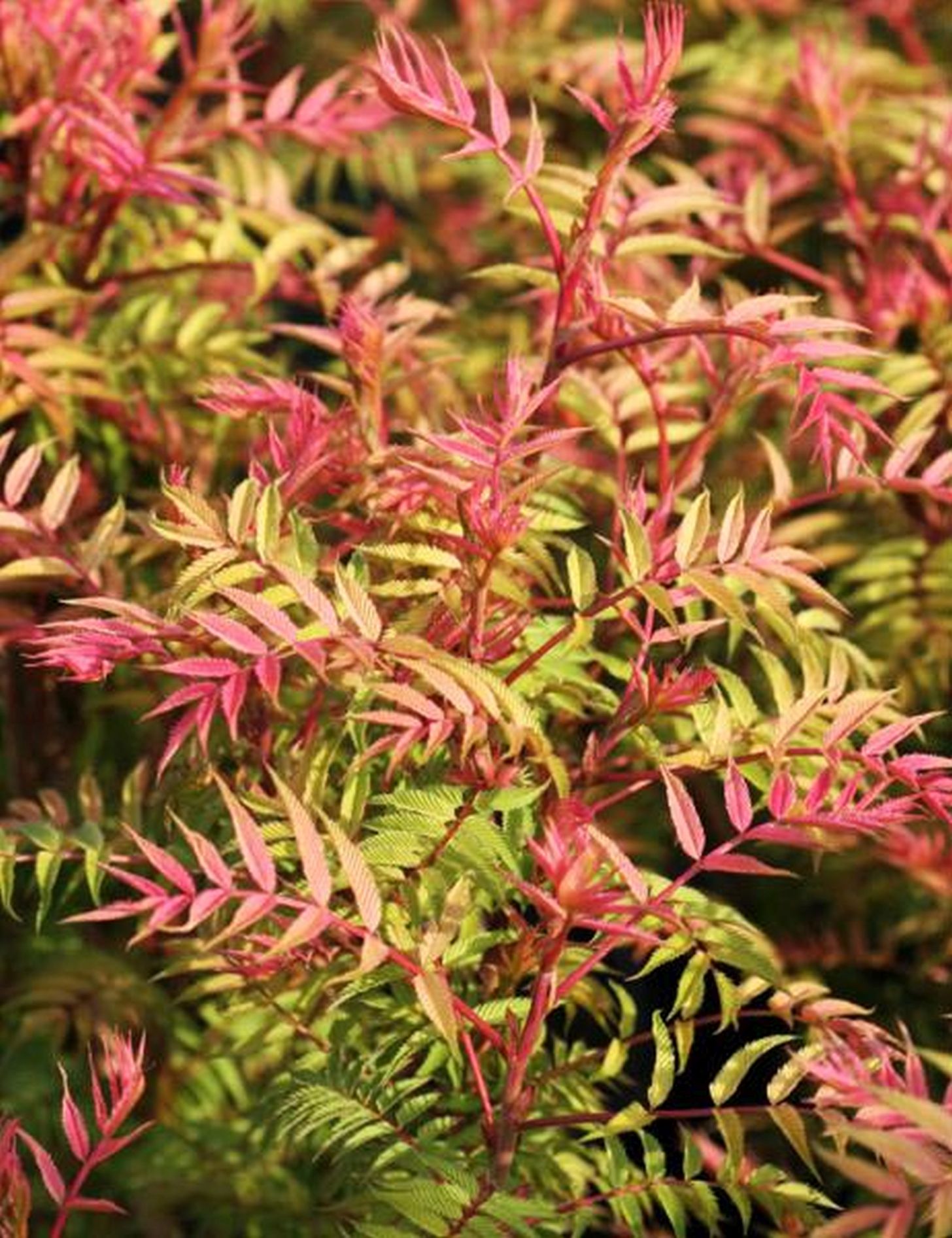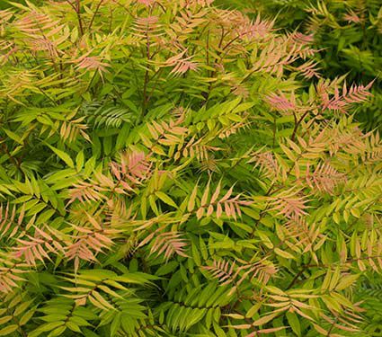 This is an exceptional colourful new sort of Meadowsweet. This bush is low-growing, stocky, reaches only 3.3 foot in height and has a regular round shape. The foliage is very spectacular: the older leaves are pale green, the younger ones are golden yellow mottled with pale green, while the freshest shoots are bronze or pink hues. This colour cavalcade is further enhanced by the snow-white panicles which appear in July and August! It is very beautiful as solitaire as well as planted in a pot!