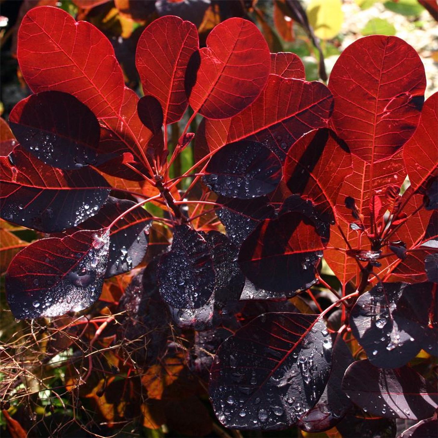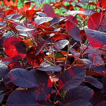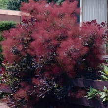 Nagy termetű, igen látványos, sötét lilásvörös levelű bokor, lombja kihajtástól lombhullásig megtartja szép színét. Júniusi virágzását követően vattacukorszerű, hatalmas lilásrózsaszínű terméspamacsai díszítik. Igényei az alapfajéval megegyezők. Rendkívül impozáns szoliter növény, az időnkénti ifjító visszametszést erős, dús növekedéssel és csodálatos lombszínnel hálálja meg. 4a USDA-zóna.