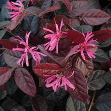 A varázsmogyorók közeli rokona ez a Kínában honos örökzöld cserje, melyet kora tavasszal, keskeny szalagszerű szirmokból álló különleges virágainak tömege díszít! A fiatal növényeket érdemes az első teleken takarni, később azonban a fejlettebb példányok jól állják a komolyabb hidegeket is! E fajtájának lombozata nagyon szép sötét, szinte feketésbordó!