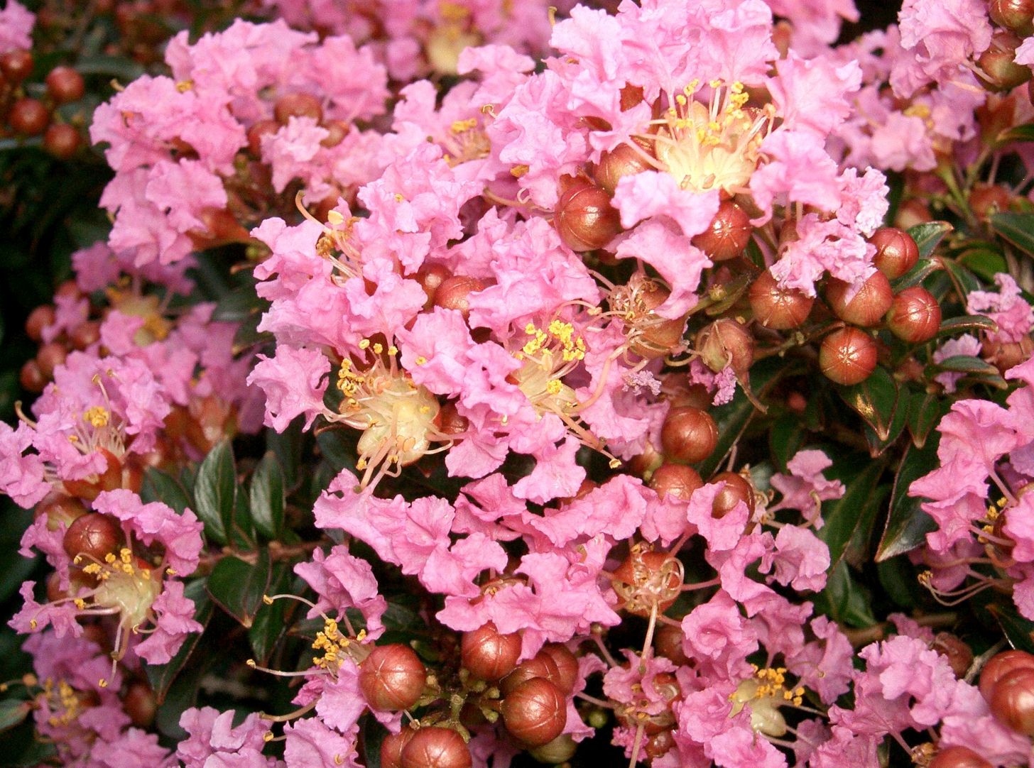 A selyemmirtusz hibrid eredetű törpe fajtája. Fényeszöld levelei vöröses árnyalatúak, feltűnő, világító rózsaszín virágait nyár végén nagy tömegben hozza.