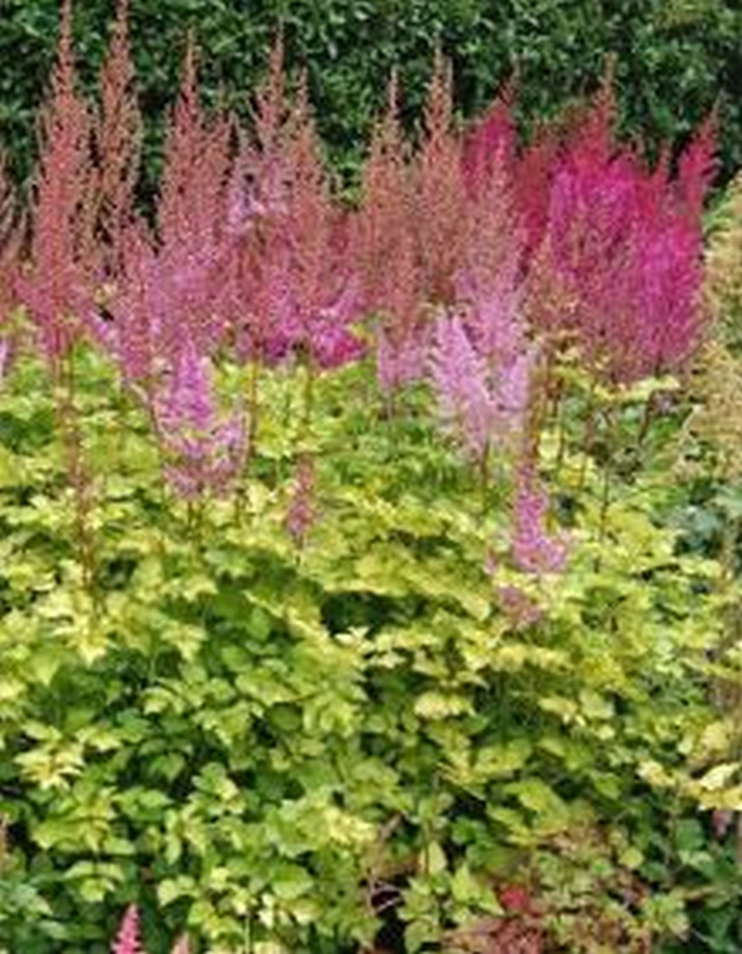 40-50 cm-es bokorrá növő, aranysárga lombozatú évelő, melyet július-augusztusban, tollszerű bugákban nyíló rózsaszín virágok tömege díszít!