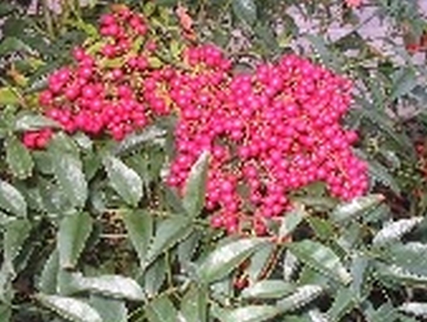 1,5 méter magasra és kb 1 méter szélesre növő örökzöld díszcserje, melyet nyár közepén méretes fehér virágfürtök, ősszel pedig nagy tömegben fejlődő piros bogyók díszítenek. Lombozata télire bíborvörösre színeződik. Az egyik legszínpompásabb kerti örökzöld!