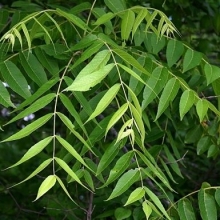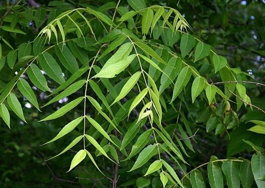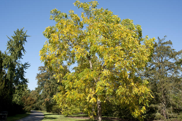 Hazájában, Észak-Amerika keleti részén (Massachusetts és Texas között) a magassága elérheti akár az 50 métert is. Spirálisan szórt állású, páratlanul szárnyasan összetett, fűrészes szélű levelei vannak. Csonthéjasra emlékeztető zárt kupacsú, durván bordázott makktermése 5 cm átmérőjű, szabályos gömb alakú és az ősz második felében érik be. Fája keresett a bútoripar számára.