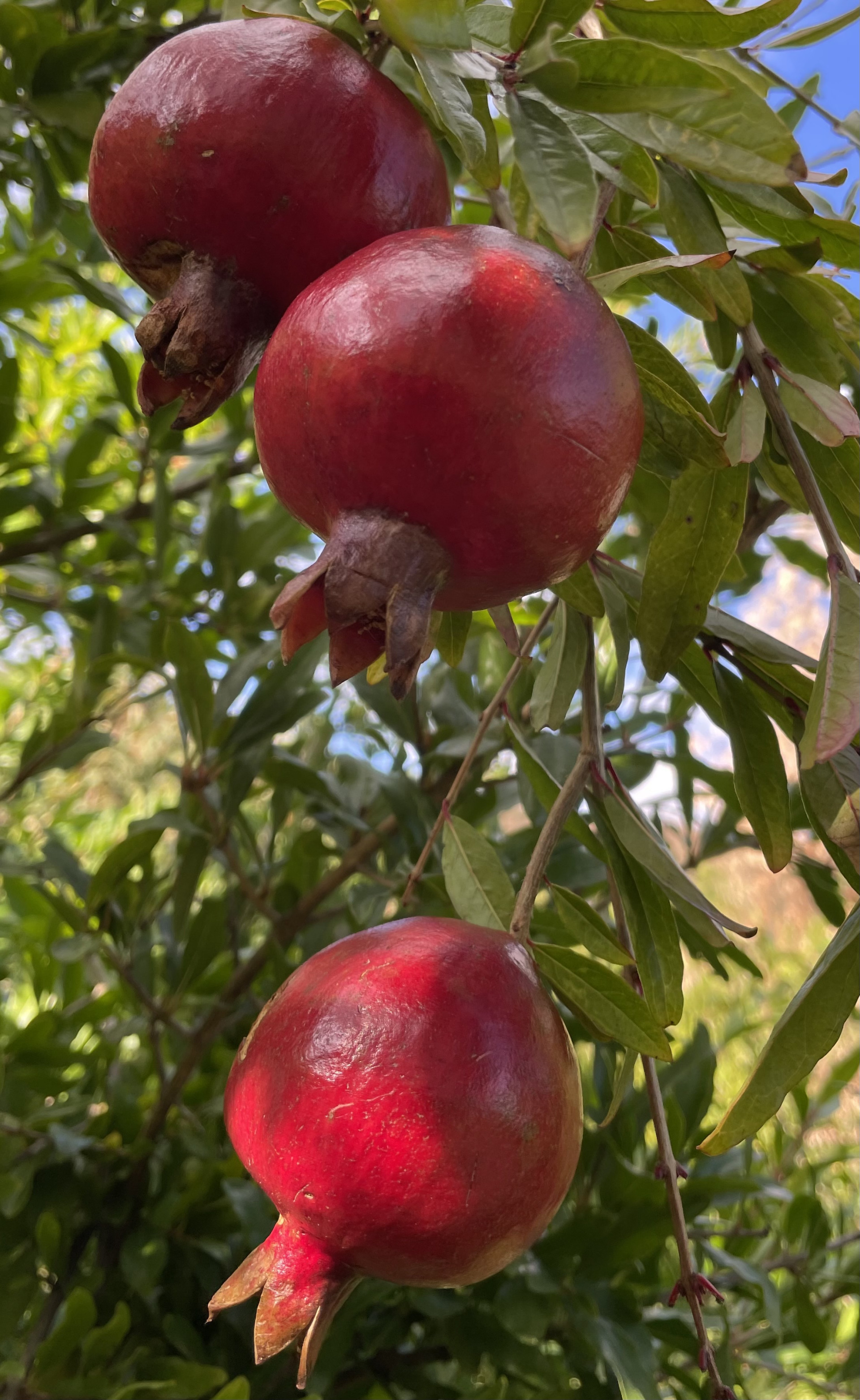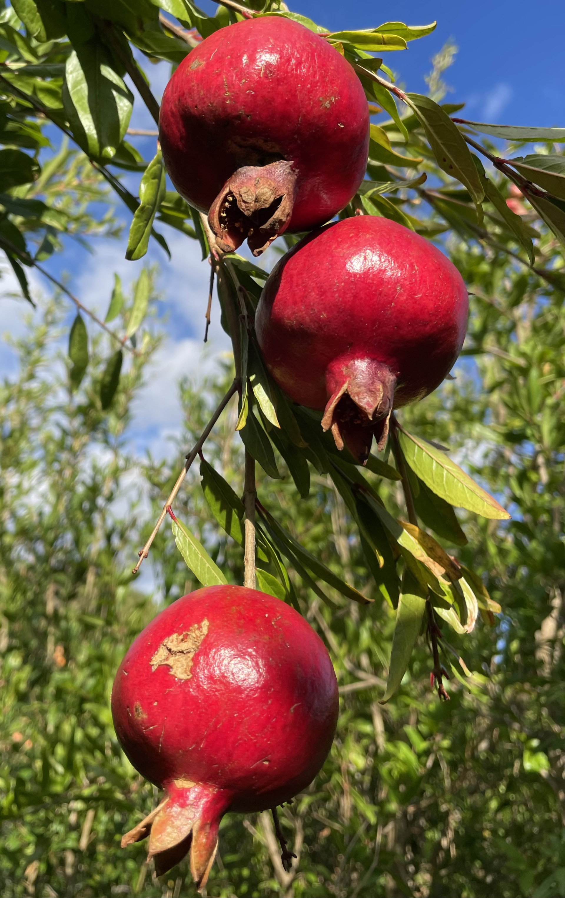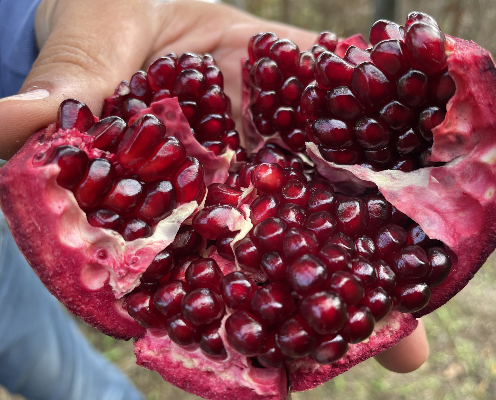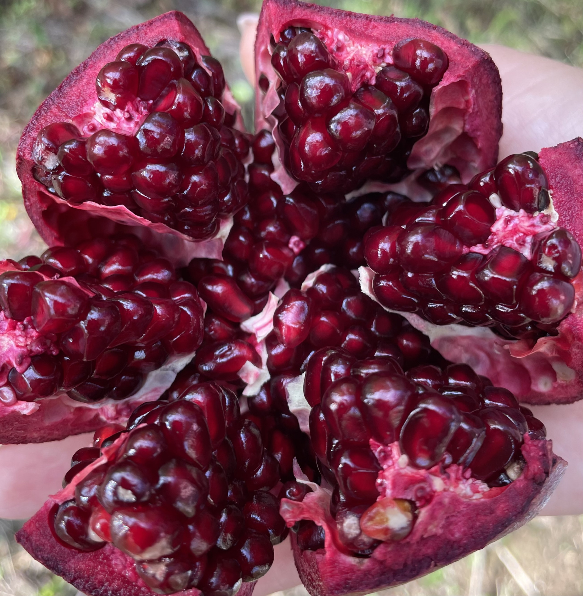 Nagyon ígéretes, saját szelekciónk! 2013-ban, Moszkvában, egy kiváló zöldség-gyümölcs piacon vásároltam egy gyönyörű gránátalma gyümölcsöt, mely az árus elmondása szerint Üzbegisztánból származott. Nagyjából 2000.-Ft-ot fizettem érte, de hazahozva a magokat természetesen elvetettem és a kb 50 legszebb csemetét kiültettem a Tenkes-hegyi kertünkbe. Mintegy 7 év elteltével e bokrok többsége még semmilyen, vagy csak nagyon gyenge termést hozott, így kiástuk és eltüzeltük őket. Volt azonban néhány olyan növény ezek között, mely szép termést adott, és ezek közül is a legszebb ez, az immár Gyűdi Bíbor-nak elkeresztelt változat! Gyümölcse kívül is szép sötétpiros, a belseje pedig sötétbordó, szinte fekete, nagyon intenzív színű és magas antioxidáns tartalmú! Íze fanyar, de magas cukortartalmú, amit az is bizonyít, hogy a kezünkre száradt levétől rendesen összeragadnak az ujjaink. Érdekes tapasztalat volt a 2024-es évjárat, amikor is a mintegy 2 hónapos, nagyon forró és nagyon száraz nyár után ennek a fajtának a külső héja ragyogó tűzpirosra, a belseje nem feketés, hanem nagyon szép, intenzív piros színűre érett, íze pedig sokkal édesebb lett, és csak nagyon enyhén volt fanyar. Várhatóan egyike lesz azon fajtáknak, melyek a legdurvább nyarak után adják majd a legjobb minőséget! Az évek többségében megbízhatóan és bőven terem! A képek többsége az említett 2024-es őszön készült.