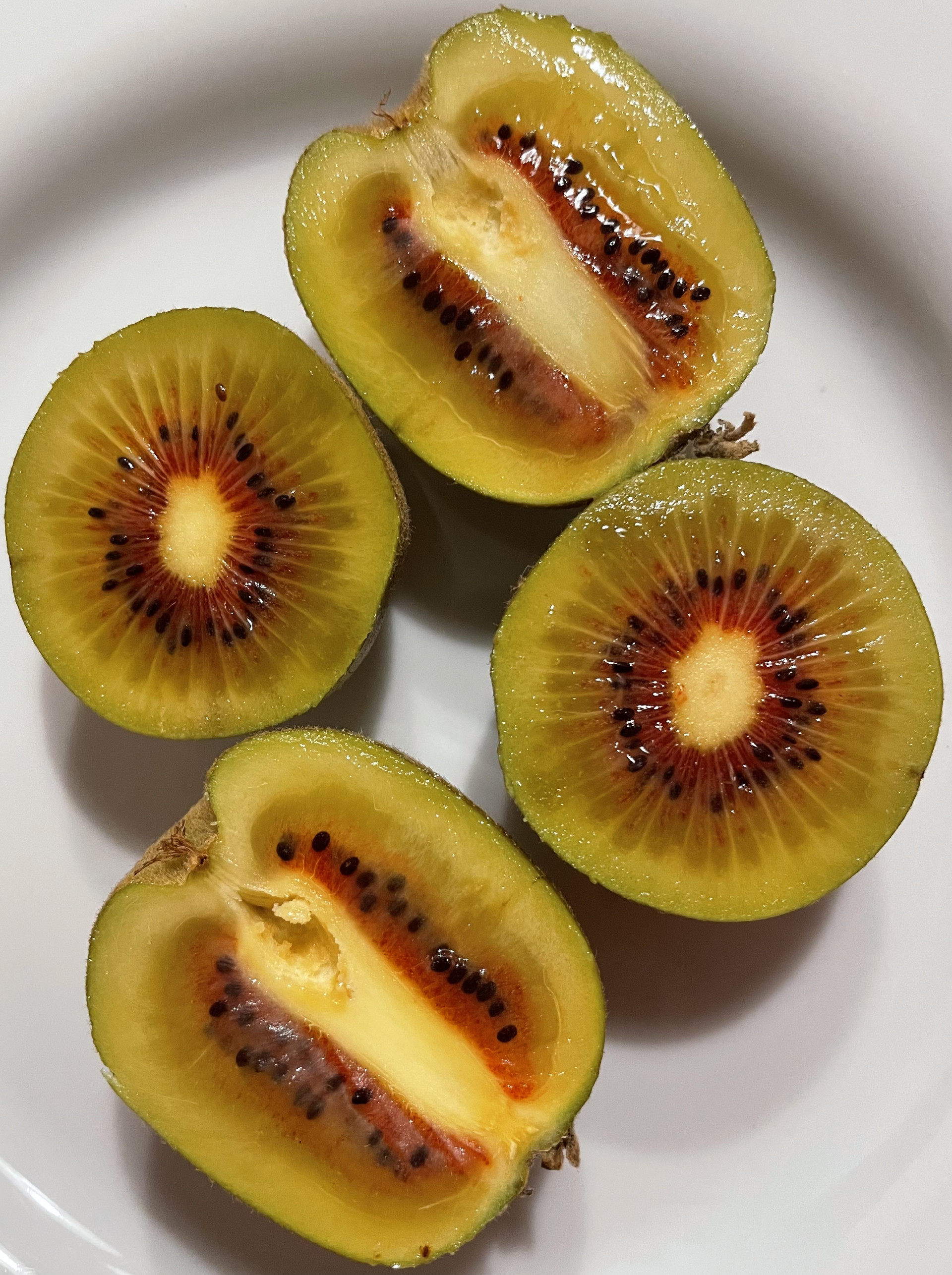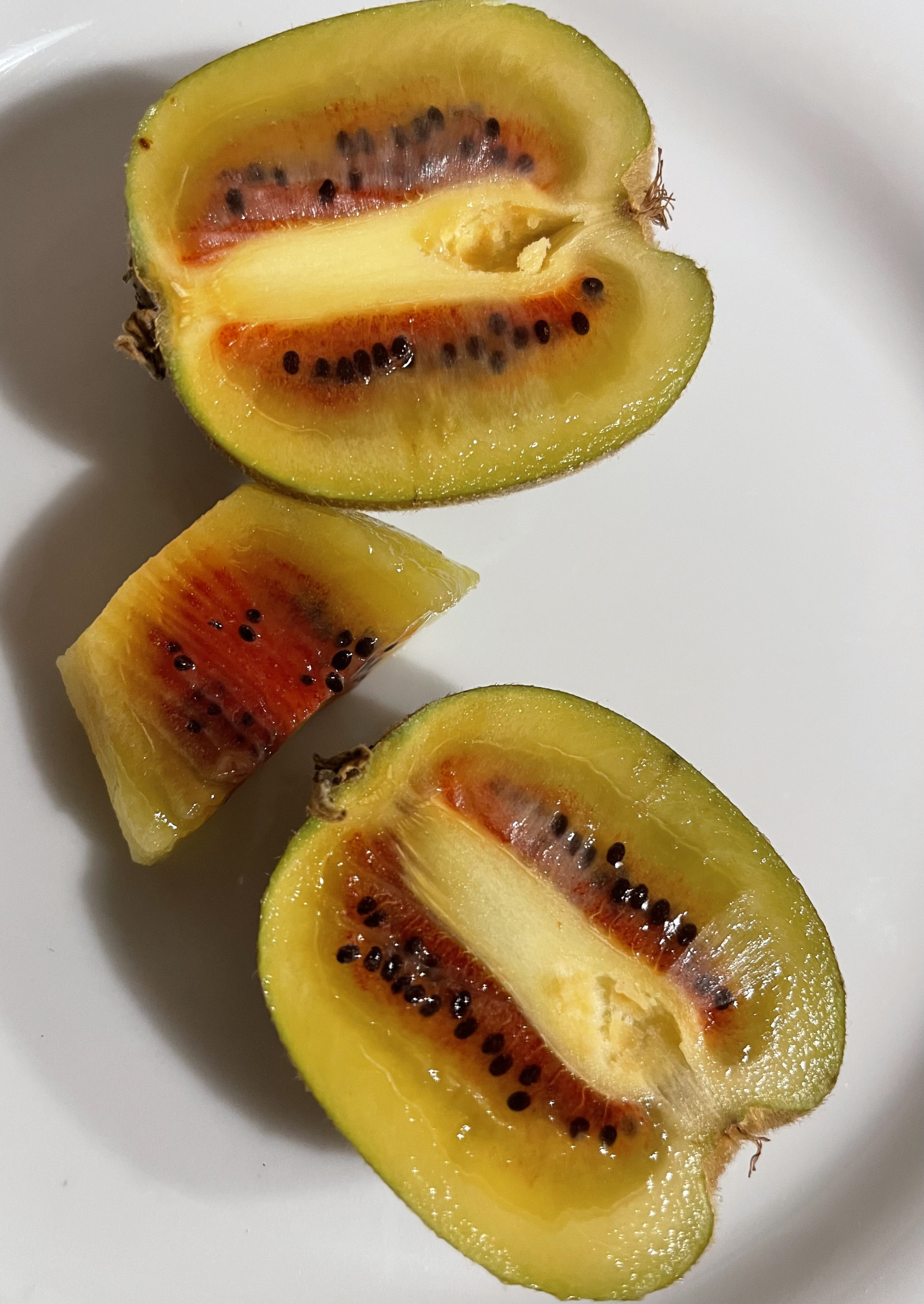 Kínából származó kivi különlegesség! A termést kettévágva a gyümölcshús alapszíne sárgás, a közepében széles piros sáv látható! A gyümölcsök mérete hasonló az ismert Hayward fajtáéhoz, de a héj sokkal kevésbé szőrös. Kifejezetten kellemes ízű, magas vitamintartalmú. A Tomury fajtával bizonytalan a porzása, ezért megfelelő porzópartnert, vagyis az Early Male Chinensis porzót kell ültetni mellé! Igazi kuriózum, melynek növekedési jellege, illetve igényei teljesen megegyeznek a Magyarországon már bizonyítottan sikeresen termeszthető Hayward(-Tomury) kiviével.