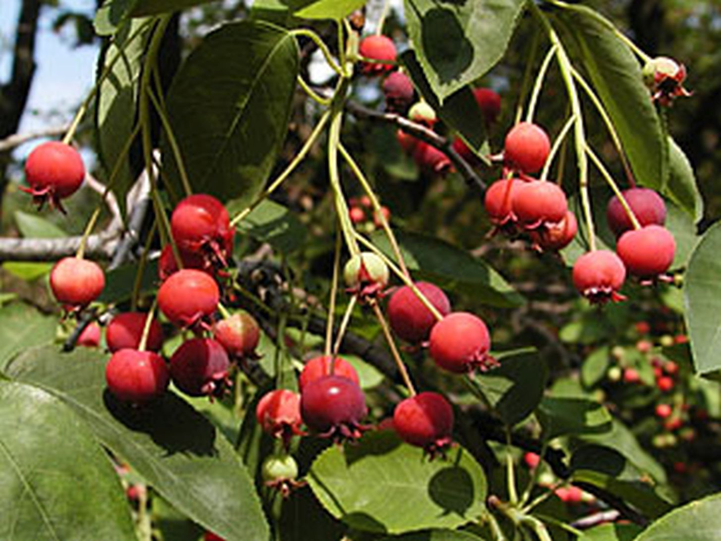 3-4 m-es cserje, kihajtáskor bronzvörös levelekkel. Fehér fürtvirágzatai április-májusban nyílnak. Júniusban érő fekete termései ehetőek. Õszi lombszine narancsvörös.