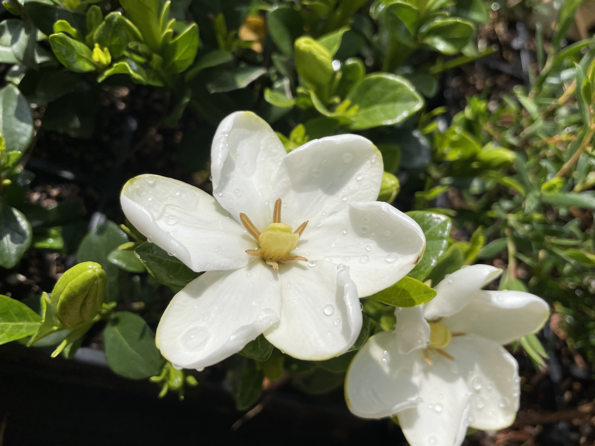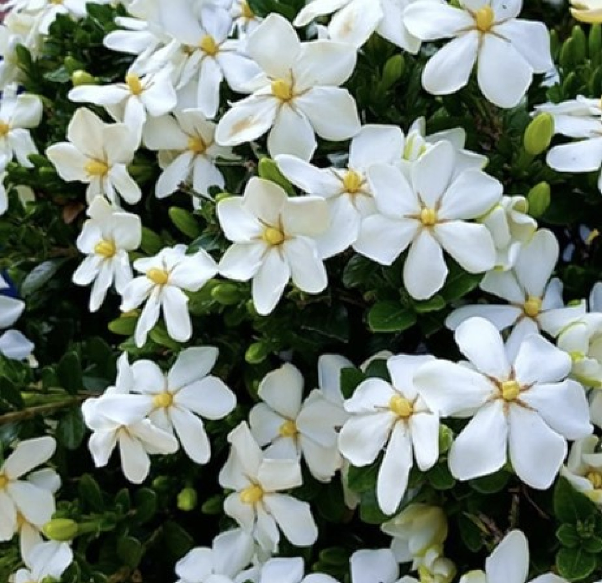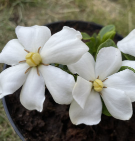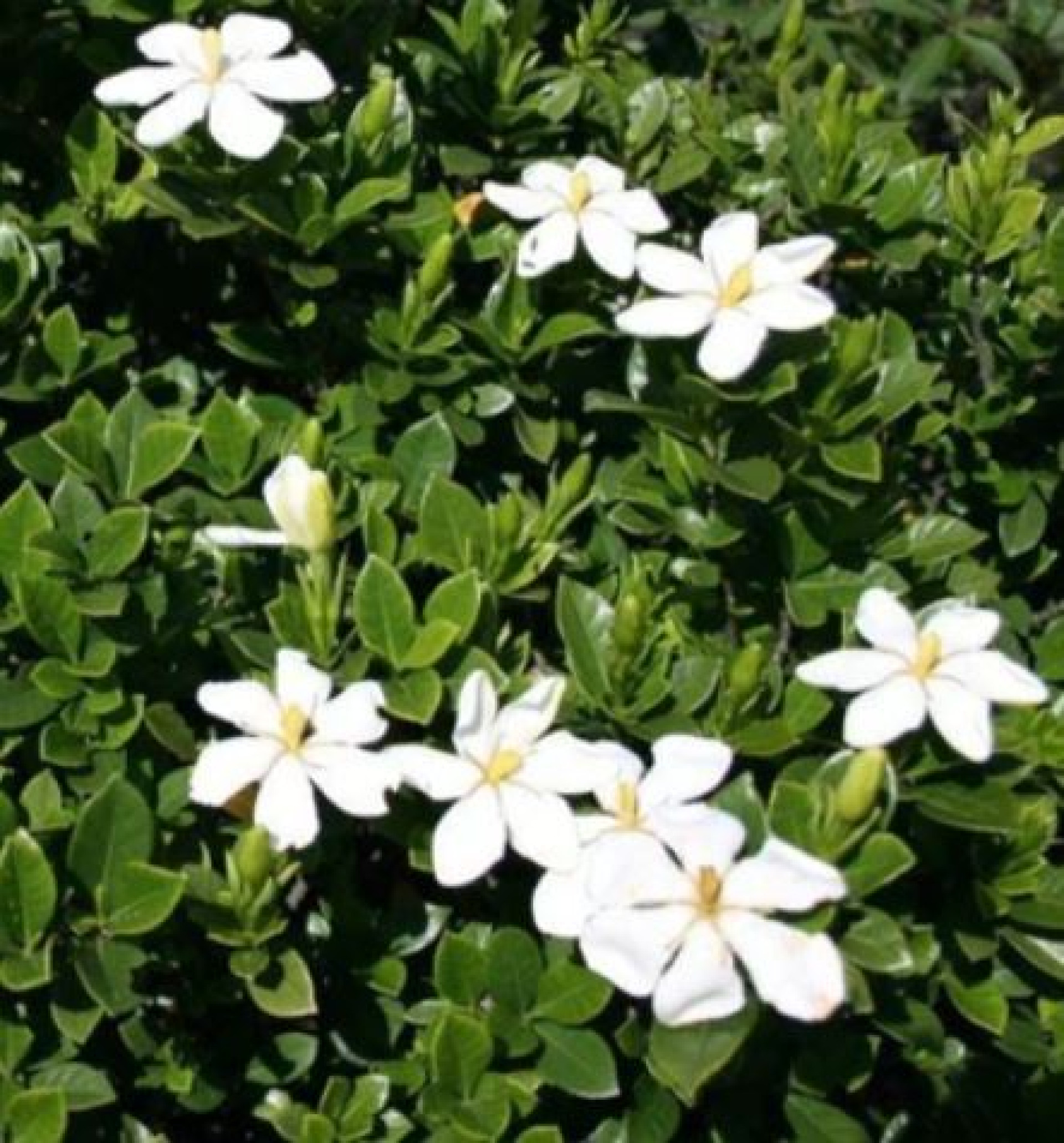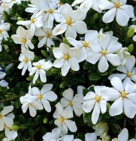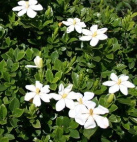 A Gardenia jasminoides Kínában és Japánban honos örökzöld cserje, nagy méretű, hófehér, vastag, viaszos szirmú, kellemesen illatos virágokkal. Ez a Kaliforniában talált változat ugyanolyan szépségű, de lényegesen jobb fagytűrésű az alapfajhoz képest. Kisebb termetű, zömök bokor lesz, mely ritkán haladja meg a 80 cm-es magasságot/szélességet. Védettebb helyeken, tápdús, kissé savanyú talajba kiültetve, megfelelő vízellátás mellett a kert igazi ékszere, dézsás növényként tartva balkonok, teraszok gyönyörű dísze!