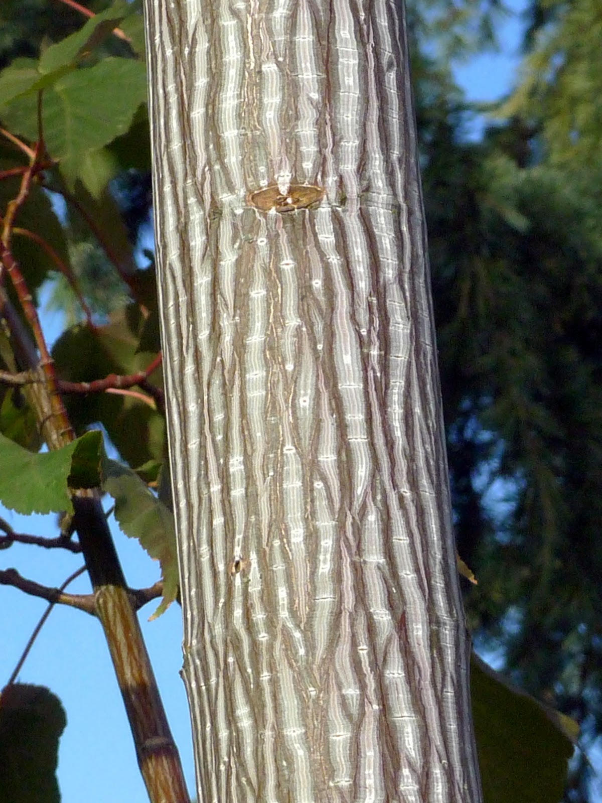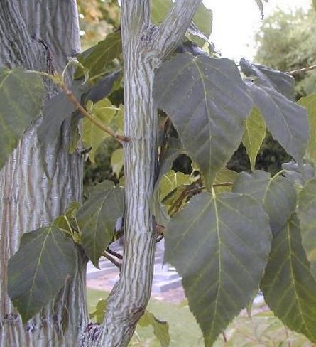 Terebélyes fává is nőhet, kérge nagyon érdekes, hosszanti zöld és fehér csíkokkal díszített! Később a csíkozottság inkább a fehér és a szürke árnyalataiban jelenik meg. Őszi lombszíne narancsvörös.
