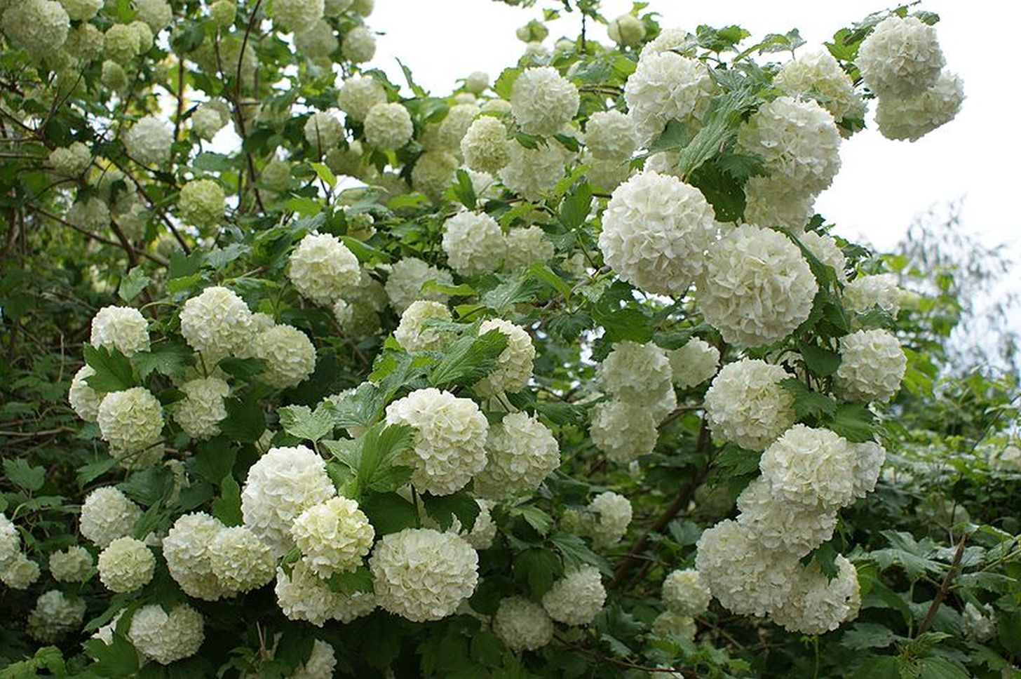 It is a 3-4 m tall, very popular, spectacular ornamental shrub, which is covered with snow-white spherical inflorescences at spring; foliage colour is fiery red in autumn.