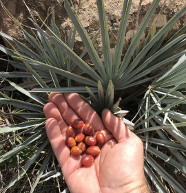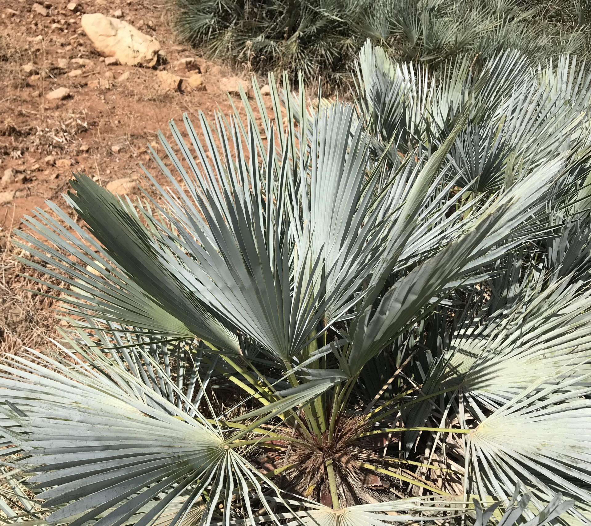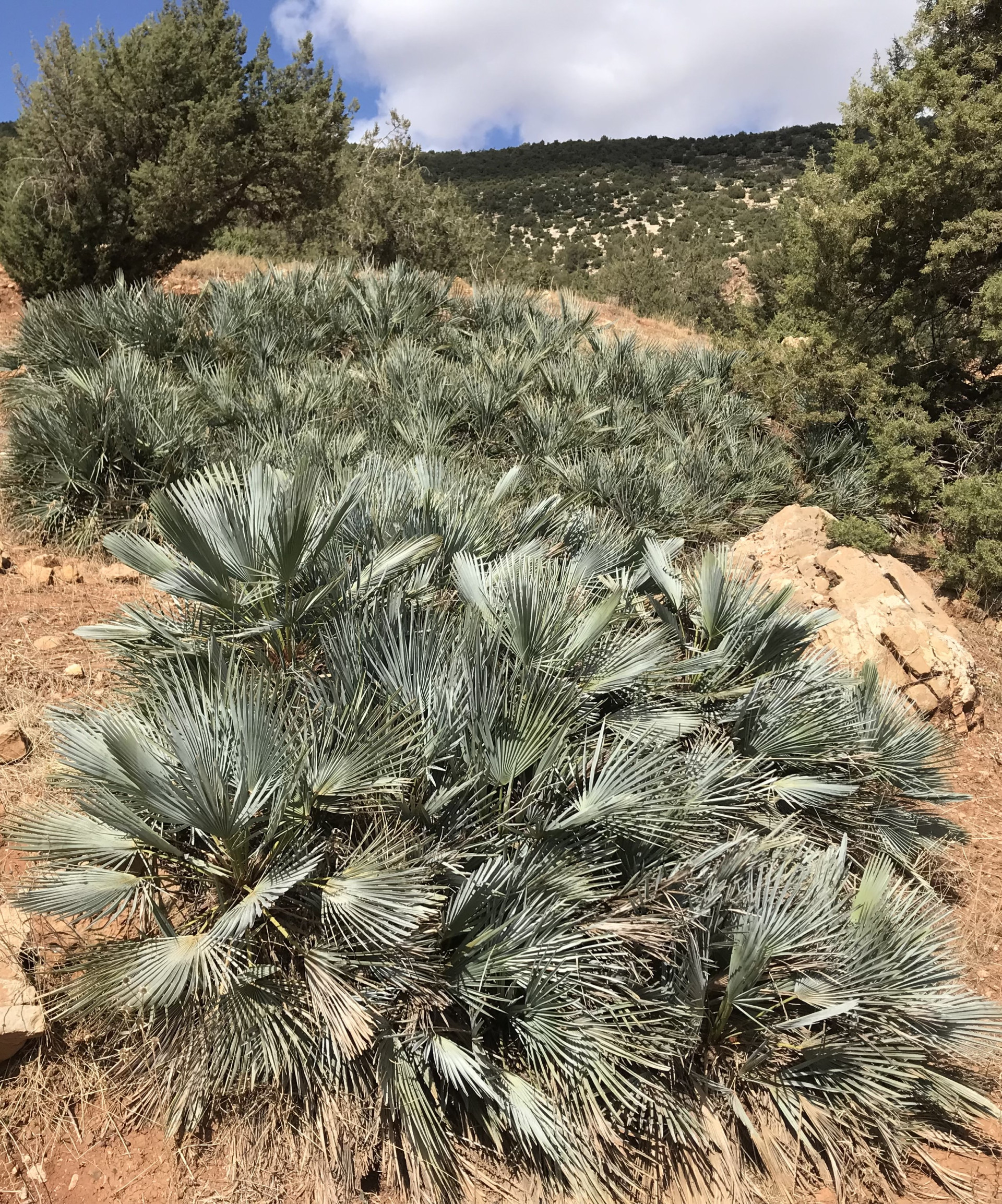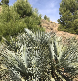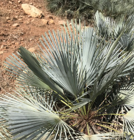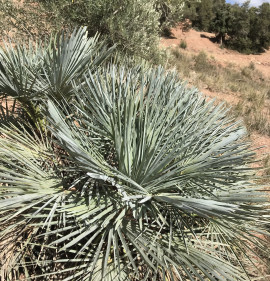 Az európai lószőr pálma gyönyörű kék változata, mely az észak-afrikai Atlasz-hegységben 2400 m-es magasságig megtalálható. Lombszíne fiatalon még inkább zöldes, később egyre hamvasabbá válik, főként a kihajtó új leveleken! Méretében hasonló a Chamaerops humilis alapfajhoz, 100-150 cm magas, 1-2 méter széles bokorrá tud fejlődni, mely gyakorlatilag tősarjak telepe. A fejlett, idősebb növények nagyon jól tűrik a szárazságot! Kiváló fagytűrése (kb. -15C fokig!) kerti kiültetését is lehetővé teszi kedvezőbb mikroklímájú fekvésekben! Ahol a füge sosem fagy el, ott ő sem fog, főként, ha télire tövét 20cm vastagon laza forgácstakarással védjük!!! Tűző, napos helyet igényel. Ha dézsásan tartjuk, tavasztól őszig legyen a szabadban, teljes napfényben. Fiatalon extrém lassan növekszik, később felgyorsul. A fiatalkori levelek még szinte fűszerűek, zöldes színűek, később, kb 3-4 éves korától kezd kékes színűre változni és tenyeresen osztott leveleket hozni.