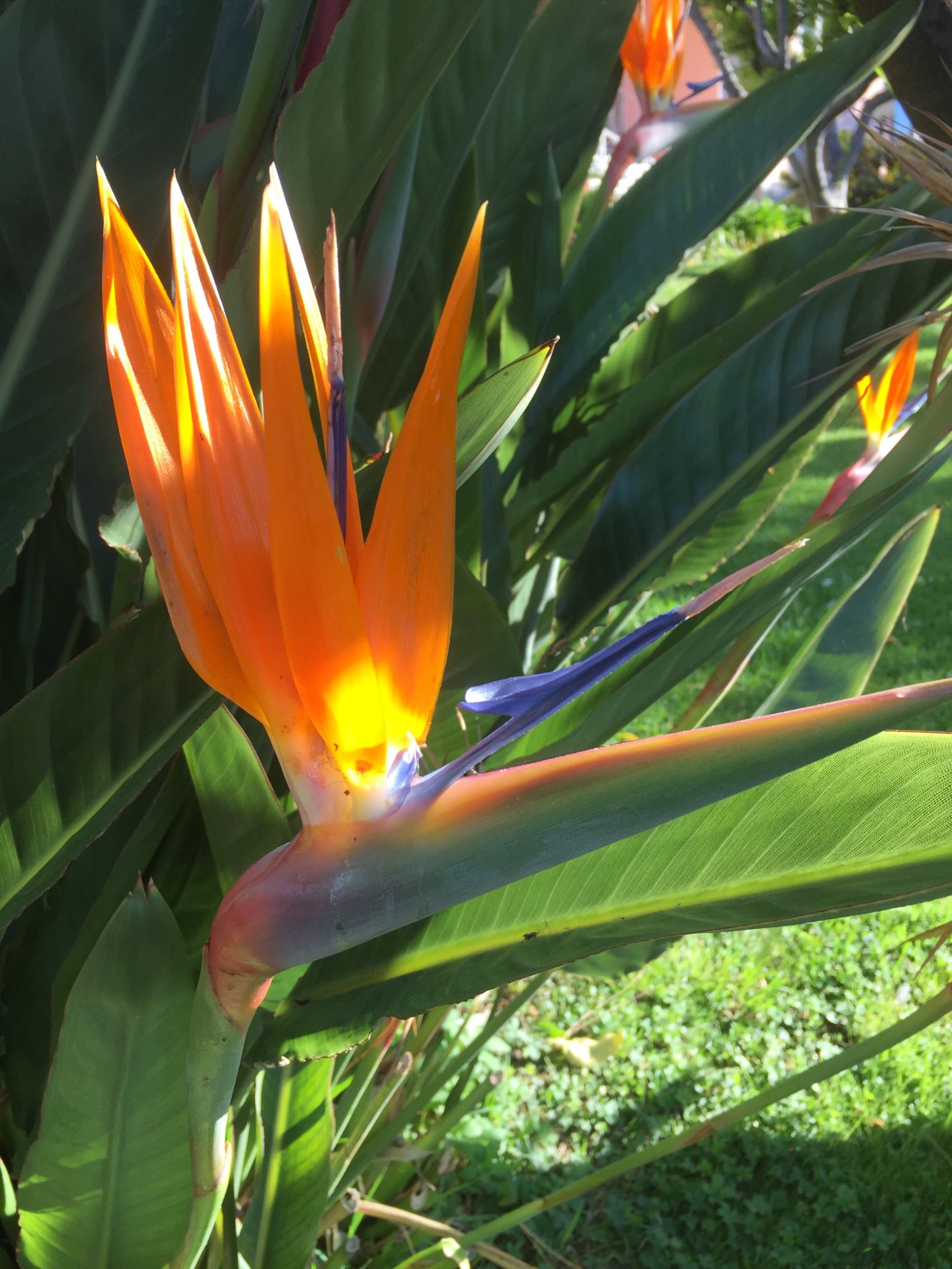 The species is native to South Africa, but naturalized in Mexico, Belize, Bangladesh, Madeira Islands and Juan Fernández Islands off the coast of Chile. The plant grows to 2 m (6.6 ft) tall, with large, strong, evergreen leaves 25?70 cm (9.8?27.6 in) long and 10?30 cm (3.9?11.8 in) broad, produced on petioles up to 1 m (39 in) long and arranged in two ranks, making a fan-shaped crown. The very unique, spectacular flowers, which emerge one at a time and consist of three brilliant orange sepals and three purplish-blue or white petals, stand above the foliage at the tips of long stalks.