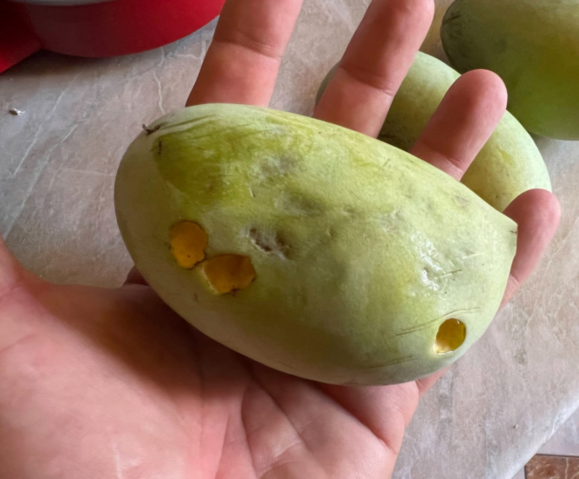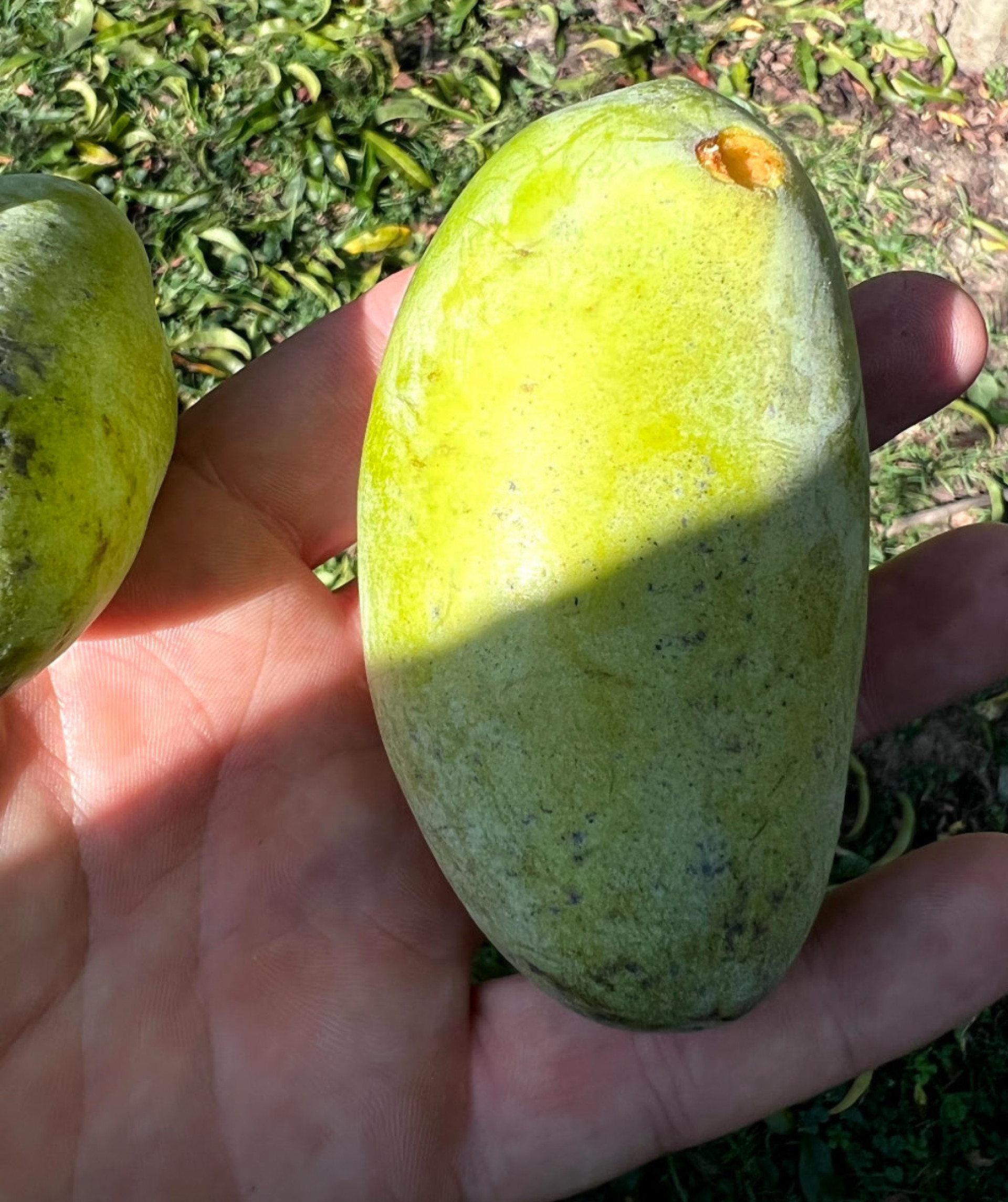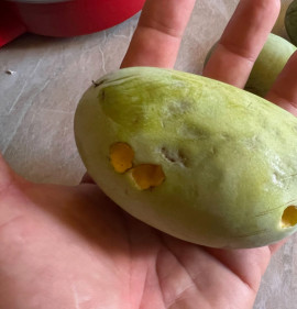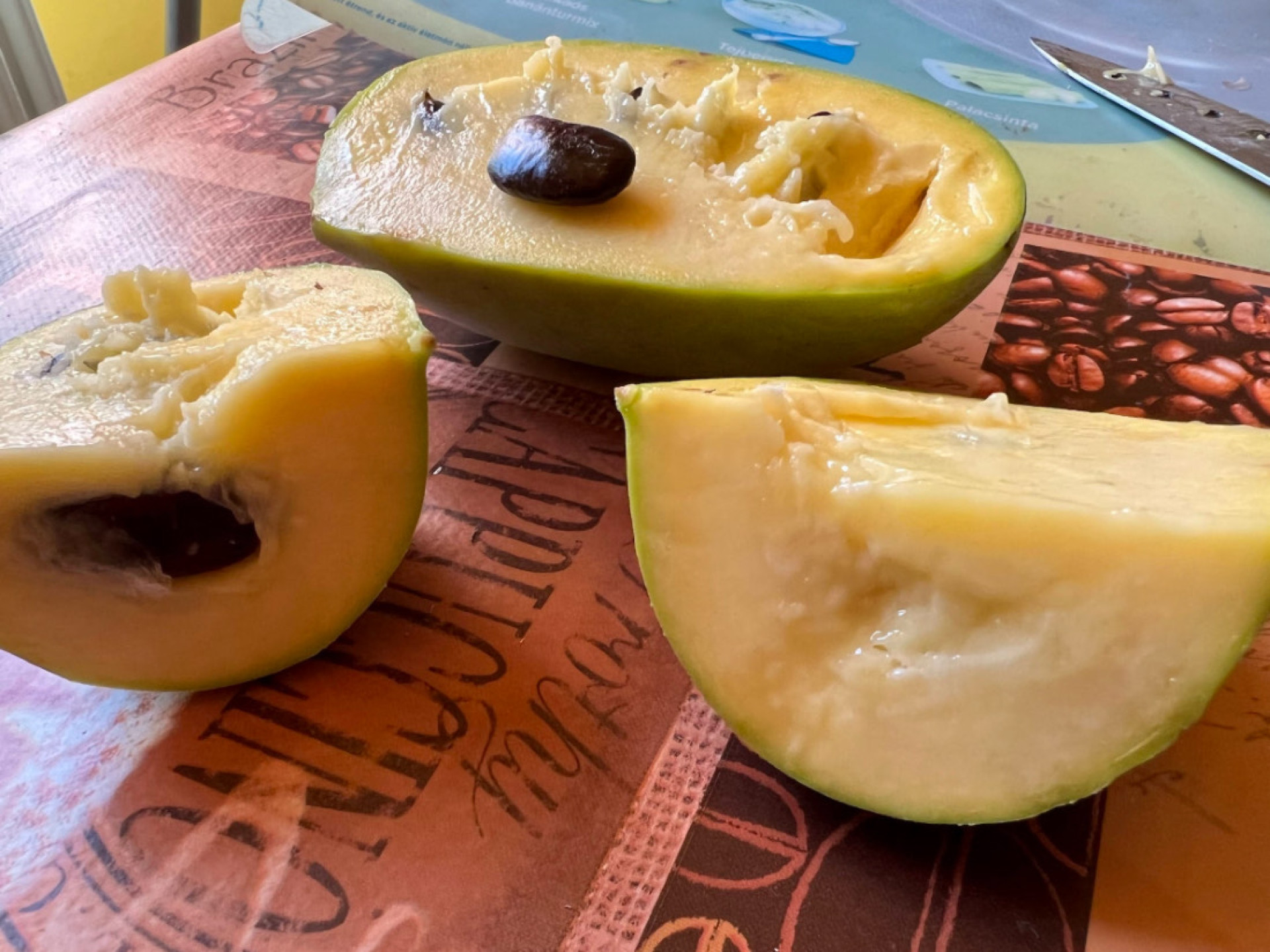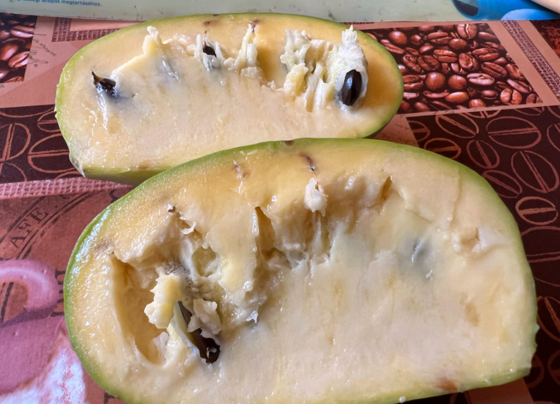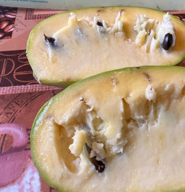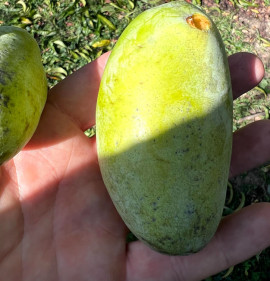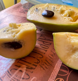 Termés:A gyümölcs 4 hét alatt érik be, augusztus közepétől októberig, ez függ a különböző tényezőktől. Éretten puha és könnyen leszedhető és jellegzetes finom illata van. Az érett gyümölcs kívülről világos-zöld, gyakran láthatóak rajta feketés foltok, de ezek nem befolyásolják az ízét és a fogyaszthatóságát. Az érett gyümölcs húsa sárga, krémes, kellemes ízű és illatú és nagyon tápláló. Ha kissé tovább hagyjuk érni, kívülről barnás színű lesz és az íze karamellesen kesernyéssé válik. A nem teljesen éretten leszedett gyümölcsök íze élvezhetetlen, de 1-2 hét alatt utóérik, fogyaszthatóvá válik. Jelenleg az elsődleges felhasználás a friss fogyasztás. Az érett gyümölcs nagyon törékeny (romlandó), szobahőmérsékleten 2-3 napig, de hűtőben 3 hétig eltartható. Összegezve elmondhatjuk, hogy ez egy nagyon finom gyümölcs, trópusi ízzel, mely nem hasonlítható egyetlen mérsékeltövi gyümölcshöz sem. Vigyázzunk, mert a sok termés alatt letörhetnek az ágak !