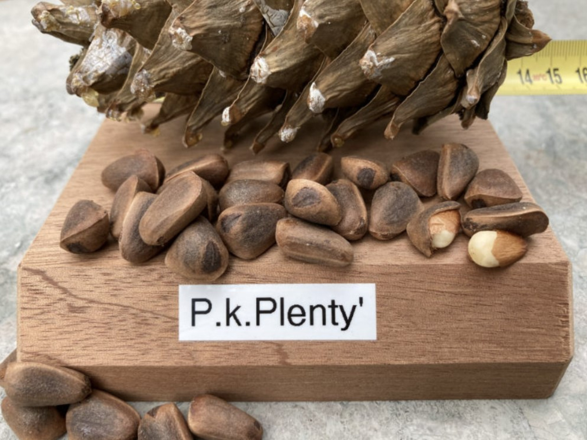 A koreai cirbolya, vagy koreai mandulafenyő Kelet-Ázsia, Kína, Korea, Mandzsúria és Szibéria száraz hegyi lejtőin, főleg az északi oldalakon fordul elő a természetben. mintegy 20 méterre is megnövő, gyönyörű habitusú növény, melynek szürkészöld tűlevelei hosszúak, szinte selymesen lágyak. Gyengébb, száraz talajokon is szépen fejlődik és a téli fagyokat is kitűnően tűri. Különlegessége az igen nagy, mintegy másfél centis magja, melynek magbele ehető, magas olajtartalmú, szinte olvadva roppanó, kissé mazsolás ízű, igazi csemege! A koreai mandulafenyő egylaki növény, vagyis a porzós és termős virágok egyaránt megtalálhatók egy növényen. Ennek ellenére a tapasztalat azt mutatja, hogy csak egy másik fajta pollenjével tud megfelelően termékenyülni, illetve tobozokat-magokat hozni, ajánlatos tehát legalább két különböző fajtát egymás közelében elültetni. Az itt kínált, Plenty nevű fajta különösen nagy magvú változat, melyből oltványokat kínálunk.