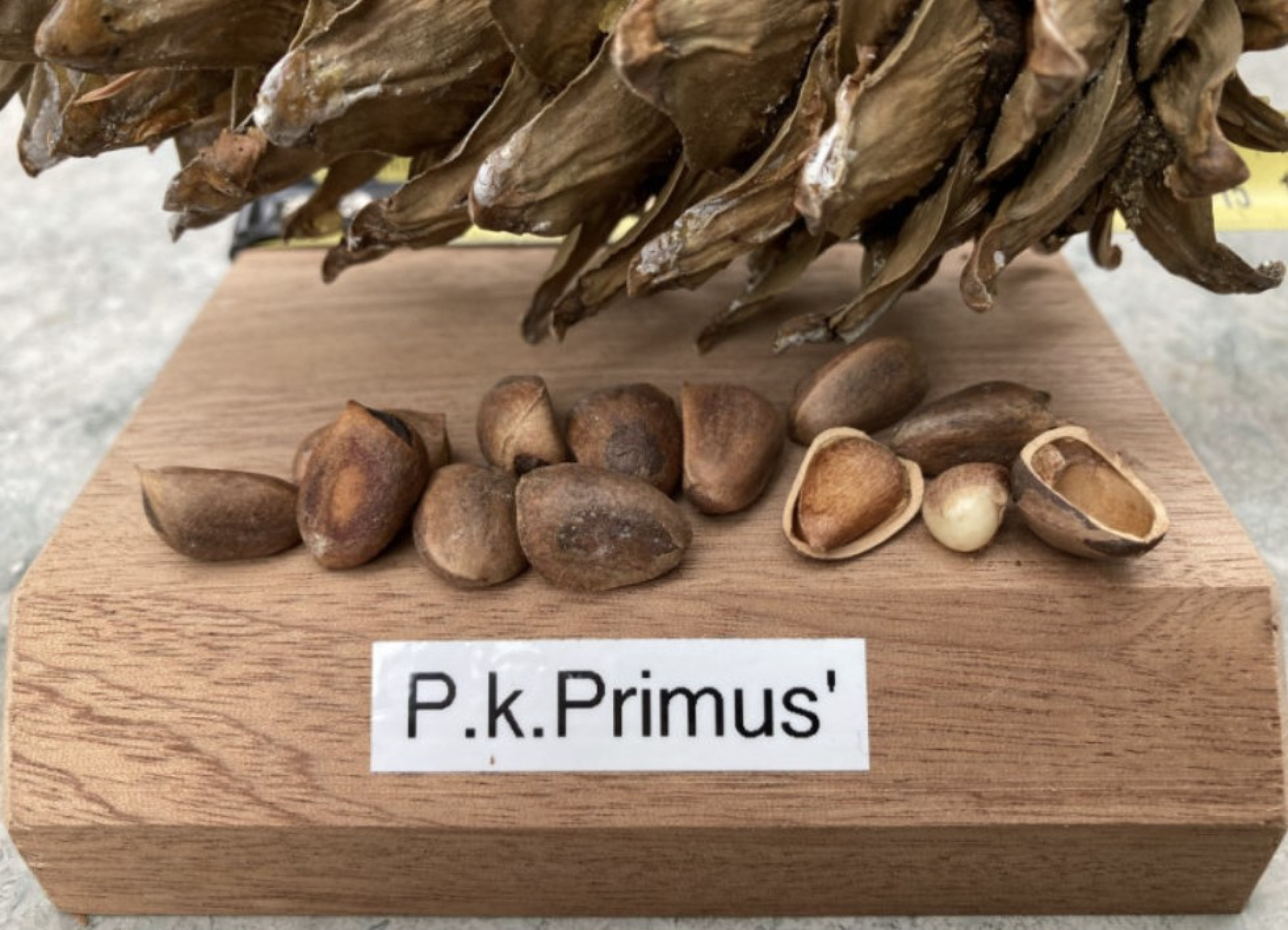 A koreai cirbolya, vagy koreai mandulafenyő Kelet-Ázsia, Kína, Korea, Mandzsúria és Szibéria száraz hegyi lejtőin, főleg az északi oldalakon fordul elő a természetben. mintegy 20 méterre is megnövő, gyönyörű habitusú növény, melynek szürkészöld tűlevelei hosszúak, szinte selymesen lágyak. Gyengébb, száraz talajokon is szépen fejlődik és a téli fagyokat is kitűnően tűri. Különlegessége az igen nagy, mintegy másfél centis magja, melynek magbele ehető, magas olajtartalmú, szinte olvadva roppanó, kissé mazsolás ízű, igazi csemege! A koreai mandulafenyő egylaki növény, vagyis a porzós és termős virágok egyaránt megtalálhatók egy növényen. Ennek ellenére a tapasztalat azt mutatja, hogy csak egy másik fajta pollenjével tud megfelelően termékenyülni, illetve tobozokat-magokat hozni, ajánlatos tehát legalább két különböző fajtát egymás közelében elültetni. Az itt kínált, Primus nevű fajta különösen nagy magvú változat, melyből oltványokat kínálunk.