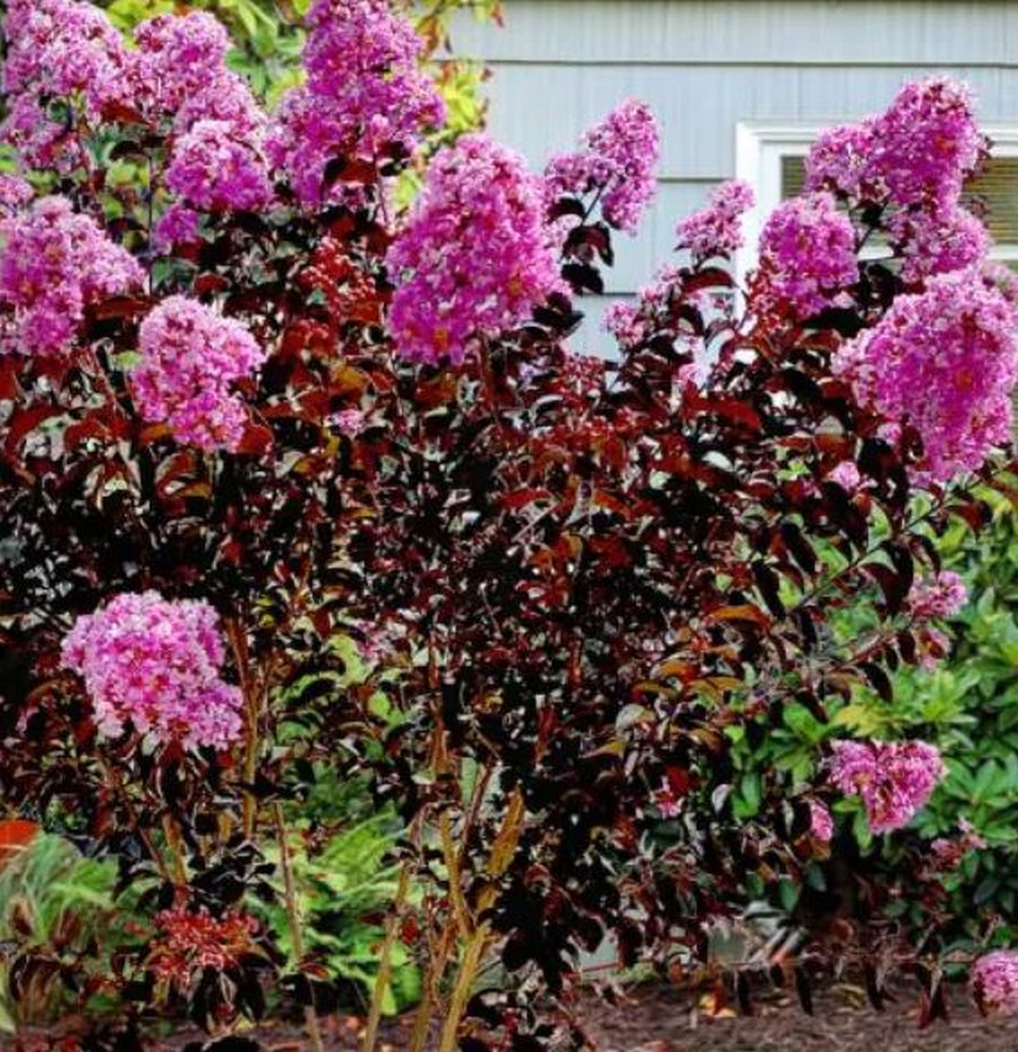 Az egyik legkülönlegesebb megjelenésű selyemmirtusz, melynek sötétbordó lombozatát élénklila virágbugák tömege koronázza meg a nyár második felében! 3-3,5 méter magasra növő, igazi kertékszer!