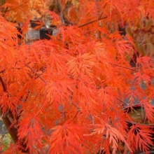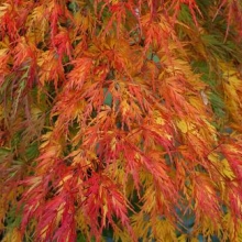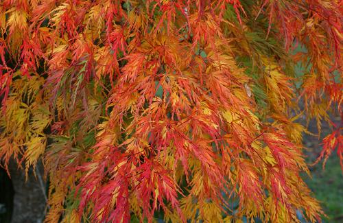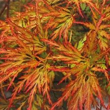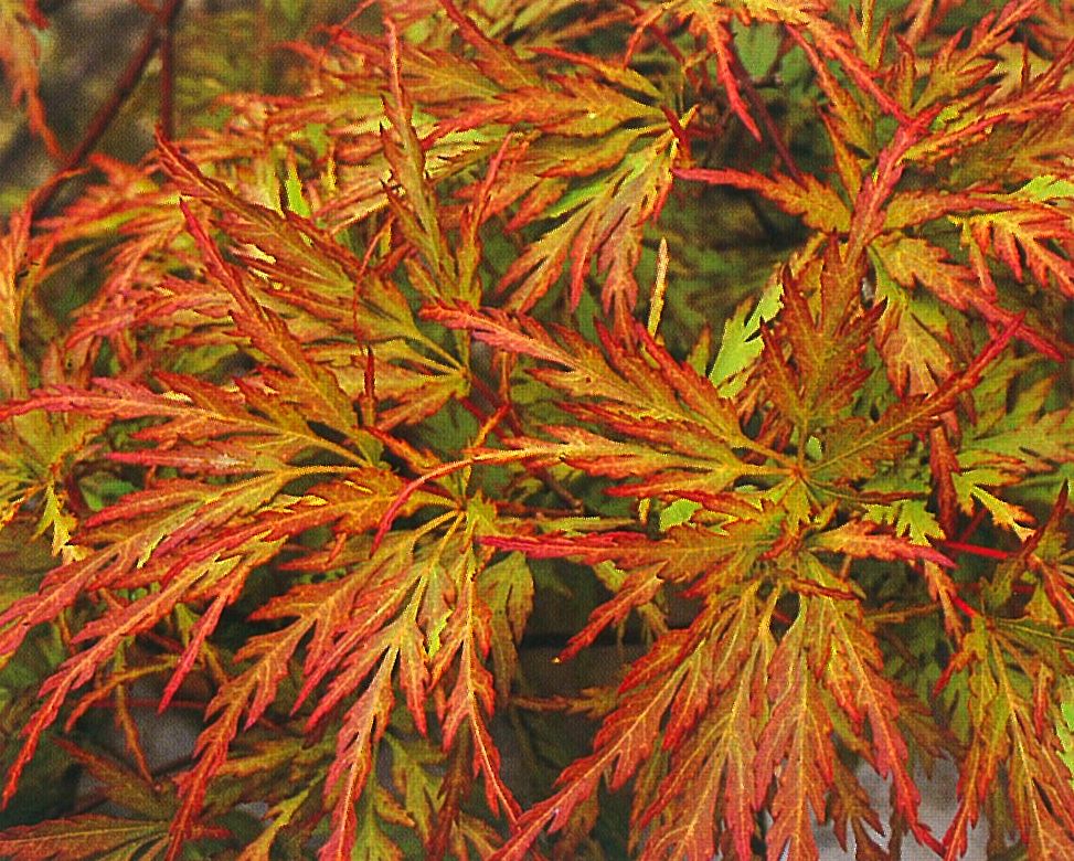 It is a very slow-growing, bush shaped Japanese maple which can grow up to three meters tall. The foliage is delicate, lace-like yarn-like dissected. Its colour is undergoing dramatic changes from spring to autumn: pale green at sprouting, vivid moss green in summer, when the autumn is approaching, reddish and orange shades appear in the foliage, and finally, the whole bush turns into blazing neon-orange!