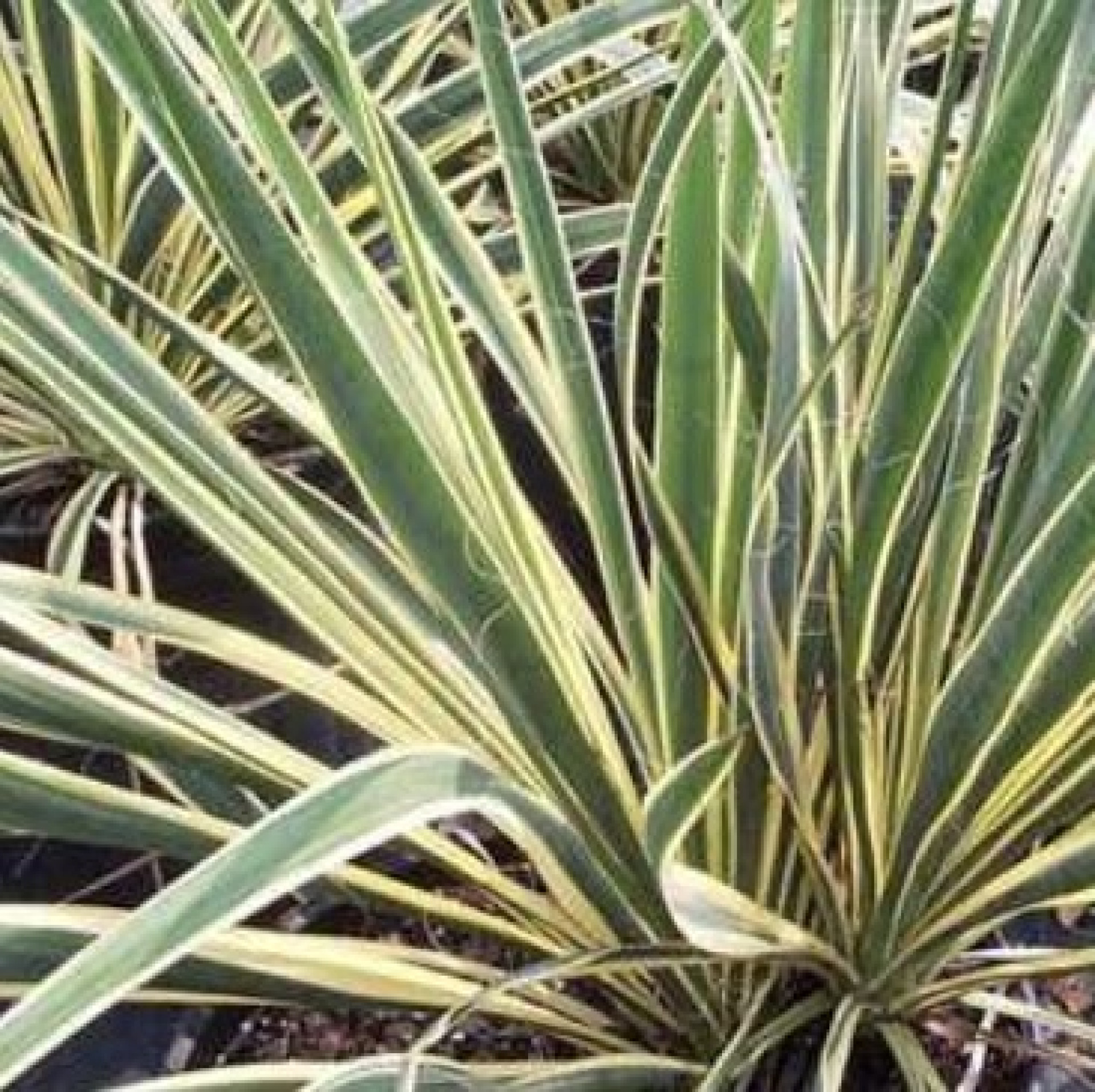 Rendkívül érdekes színezettségű pálmaliliom, a levelek széles krémsárga szegéllyel díszítettek!
