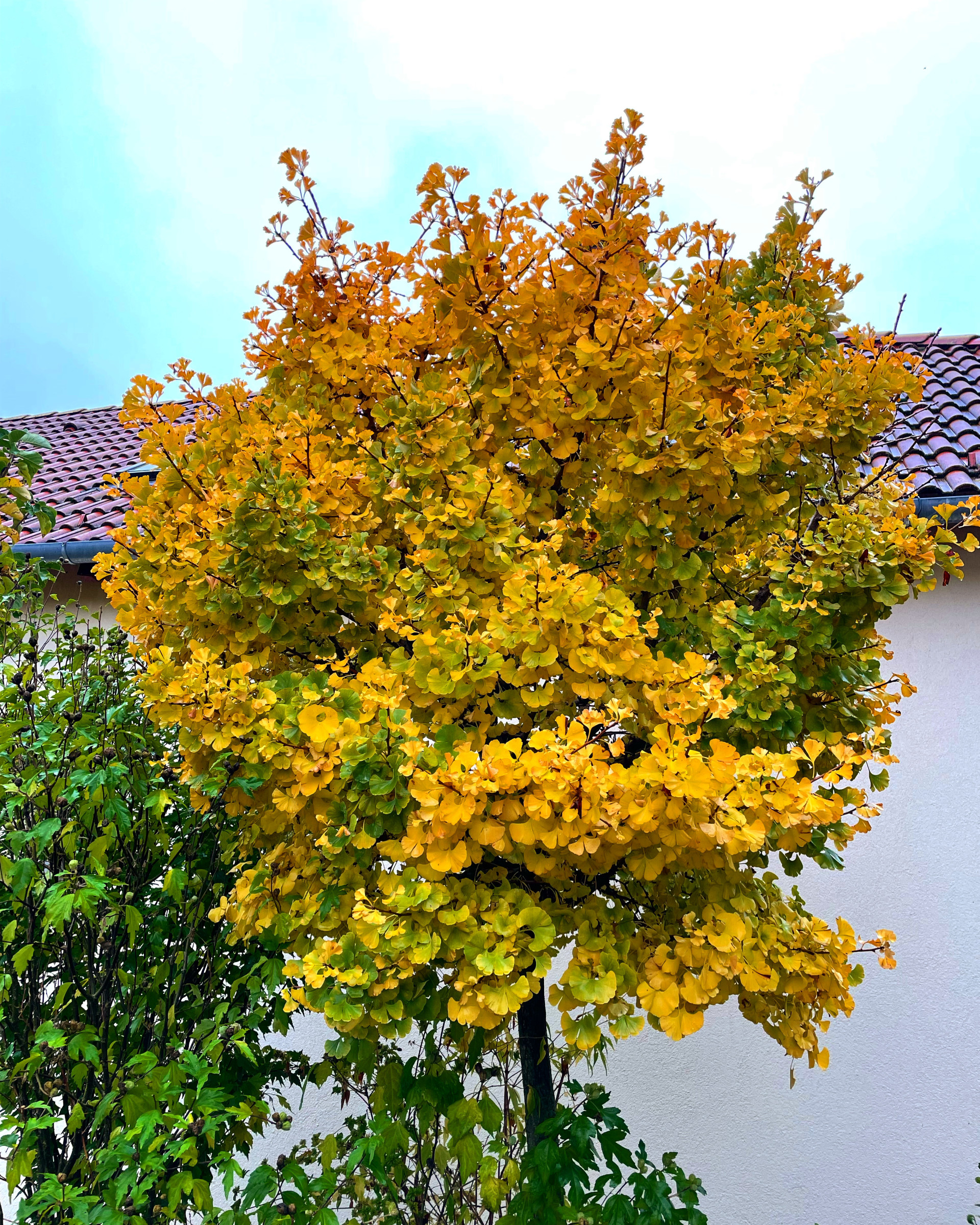GINKGO BILOBA `MARIKEN`: a dwarf variety of Gingko biloba, with a natural rotund shape. We can use pruning to keep those shoots in order that grow out of the roundish shape. A very decorative speciality with small, crispate foliage. The grafts we offer have a small trunk.