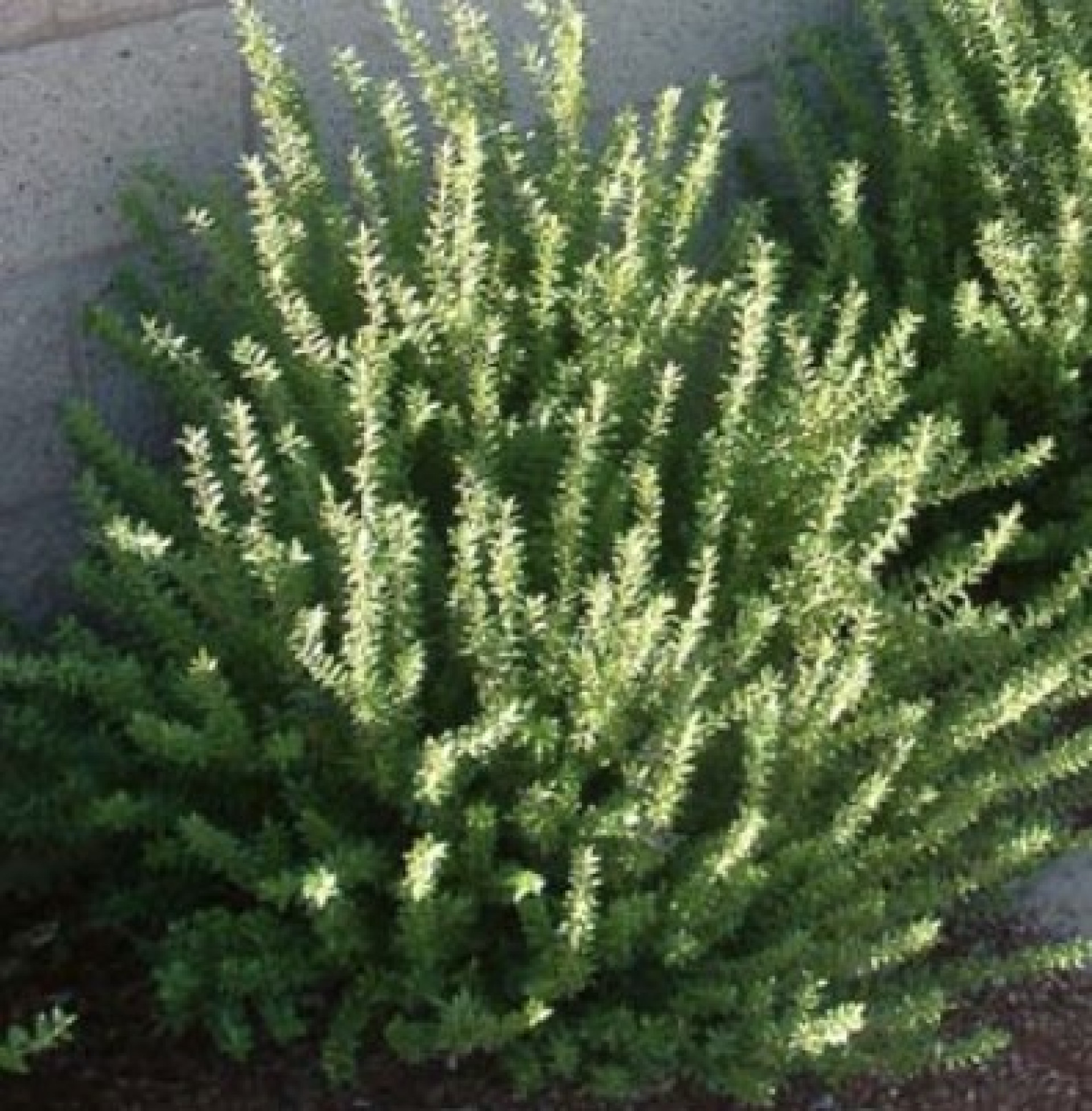 Mutatós lombozatú, örökzöld cserje, mely a mediterrán térség egyik leg-ikonikusabb eleme. Az alapfaj a természetes élőhelyein 3-4 méterre is nőhet, de ez a törpe változat legfeljebb 70-90 cm magasságot és hasonló szélességet tud elérni. Krémfehér, illatos virágait a hosszan kinyúló porzók teszik különlegessé. A virágbimbók gömbölyűek. A tömegesen termő kékeslila termése a növényt a virágzás után is igen látványossá teszi. Az egész növény (virág, termés és a levelei) sok illóolajat tartalmaz, amit az ókortól kozmetikai célokra használnak fel.