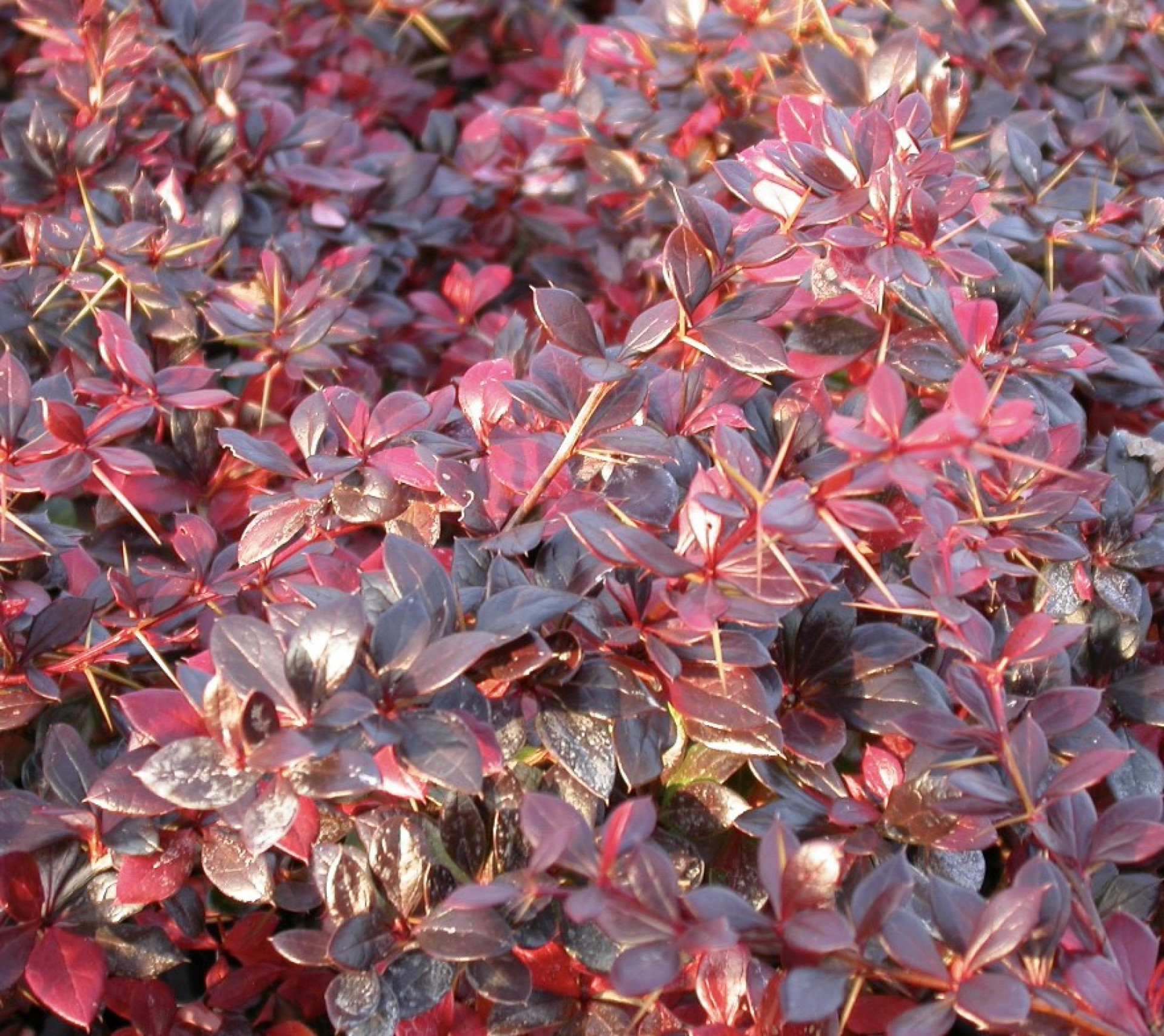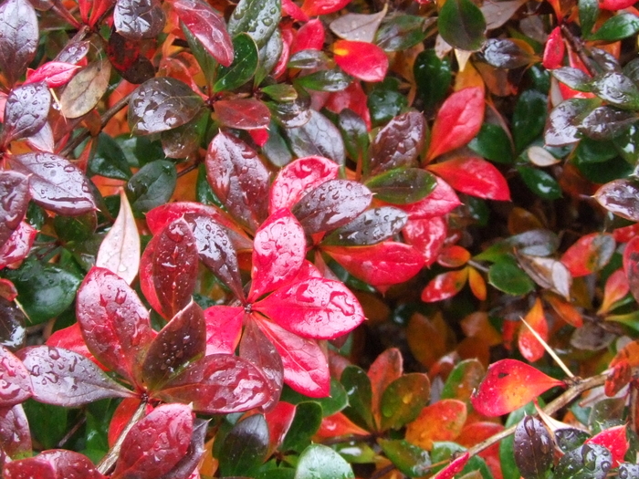 3.3-5 feet tall (1-1.5 m), slightly flattened sphere-shaped evergreen shrub. Its leaves are sparkling, shiny brownish-red, while turn into vivid red colour in autumn. The yellow flowers bloom in late April or early May. This is an outstanding hedge plant or ground cover.